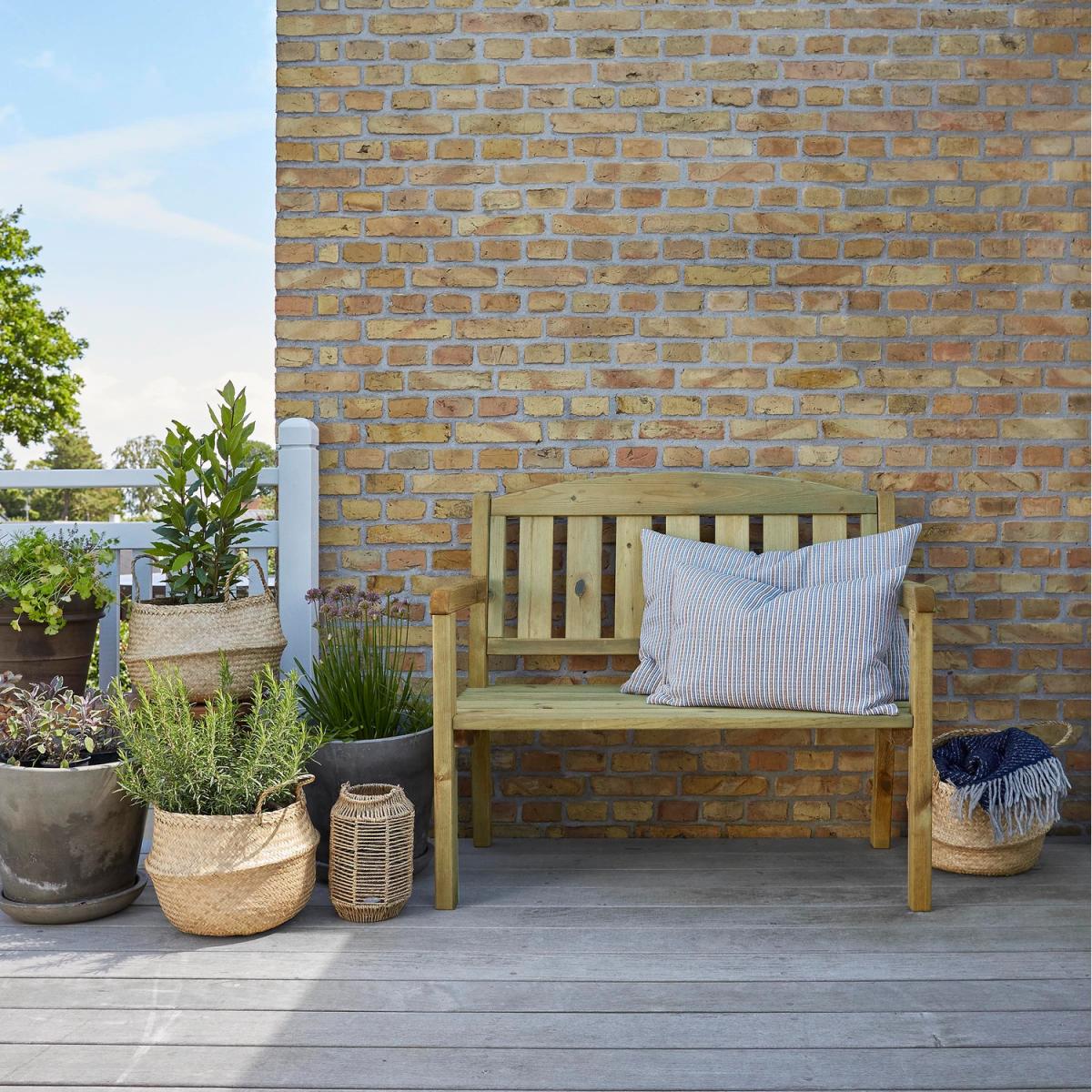 I love this two-seater bench for its classic, natural appearance and sturdy construction, making it a versatile addition to both traditional and contemporary garden spaces. Its warm brown finish acts as a neutral foundation, allowing it to fit seamlessly into cottage gardens, minimalist patios, or even urban balcony environments. To style it effectively, consider pairing it with colourful outdoor cushions for added comfort and visual interest, or position it under a shaded tree or pergola for a relaxed, inviting vibe. Practical tips include colour-coordinating with planters or outdoor rugs and maintaining the wood with a seasonal sealant to ensure longevity. Overall, it's a functional yet charming piece that encourages outdoor relaxation and conviviality.