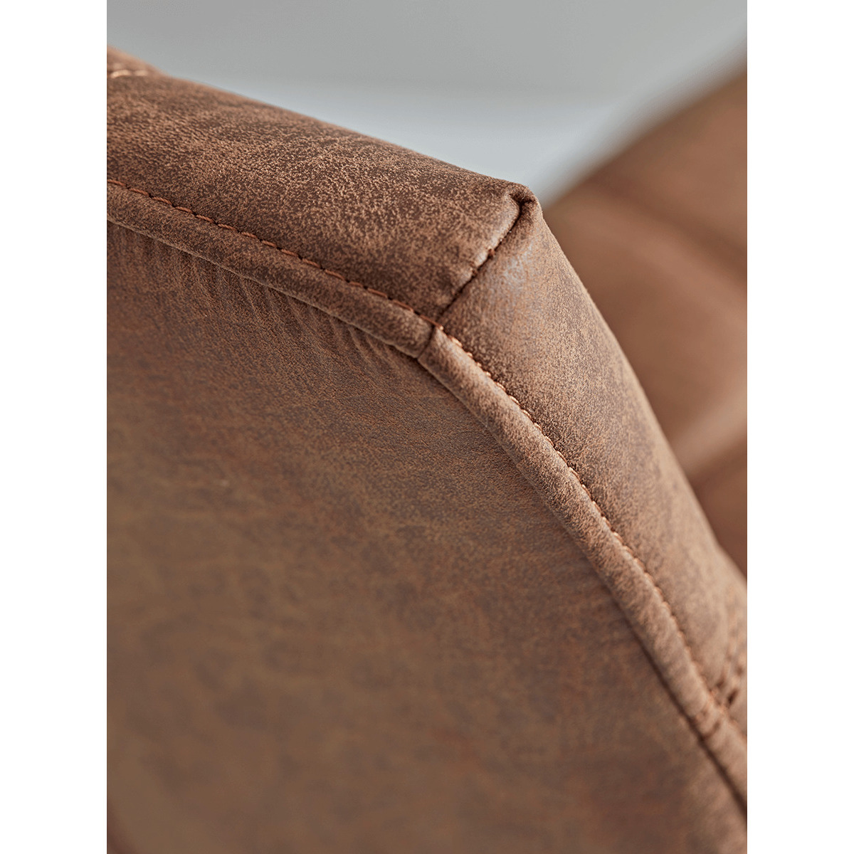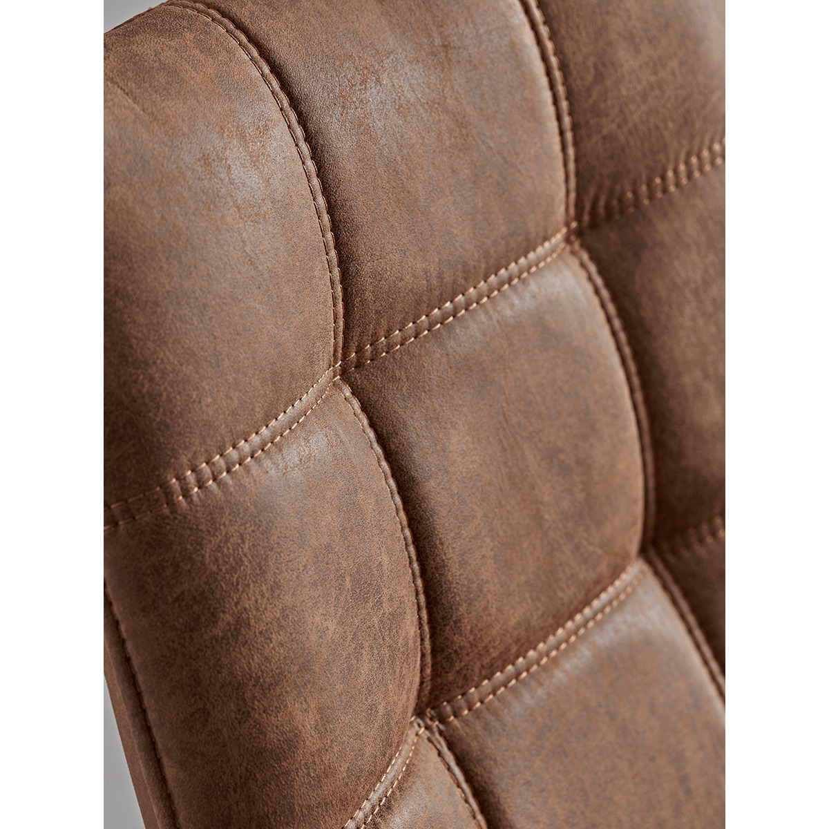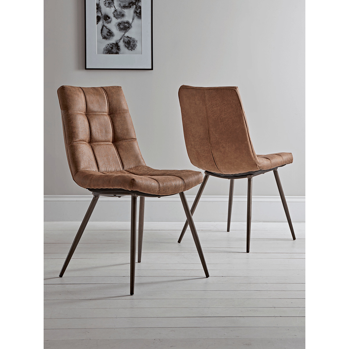 With a sleek, simple silhouette and comfortable seat upholstered in faux leather, our set of two factory style dining chairs in tan will make an edgy addition to your kitchen décor. The fabric is finished in a quilted effect, and sits on black iron legs.
