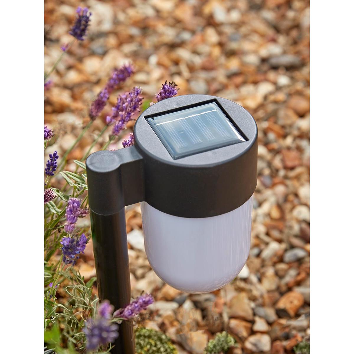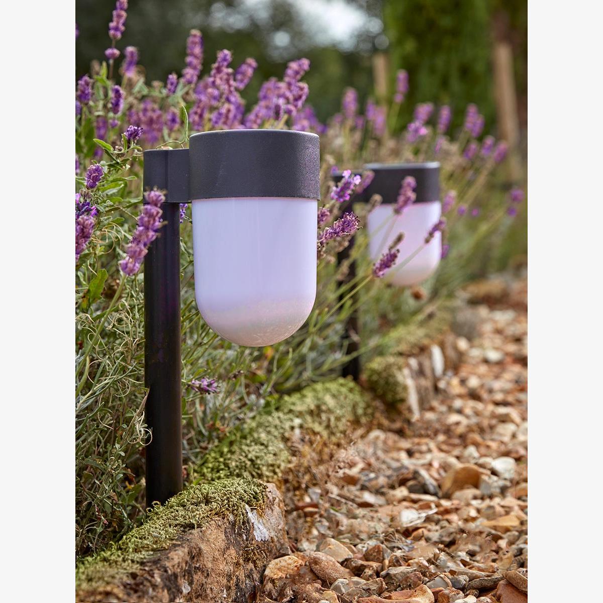 Refine pathways and lawn edges by adding a pair of our solar stake lights to highlight the way. Providing up to six hours working time, these lights simply push into the ground. Lozenge shaped lights on simple black stalks direct the beam down to the ground. Discover how to create the perfect lighting scheme for your home and garden using our Lighting Buying Guide.
