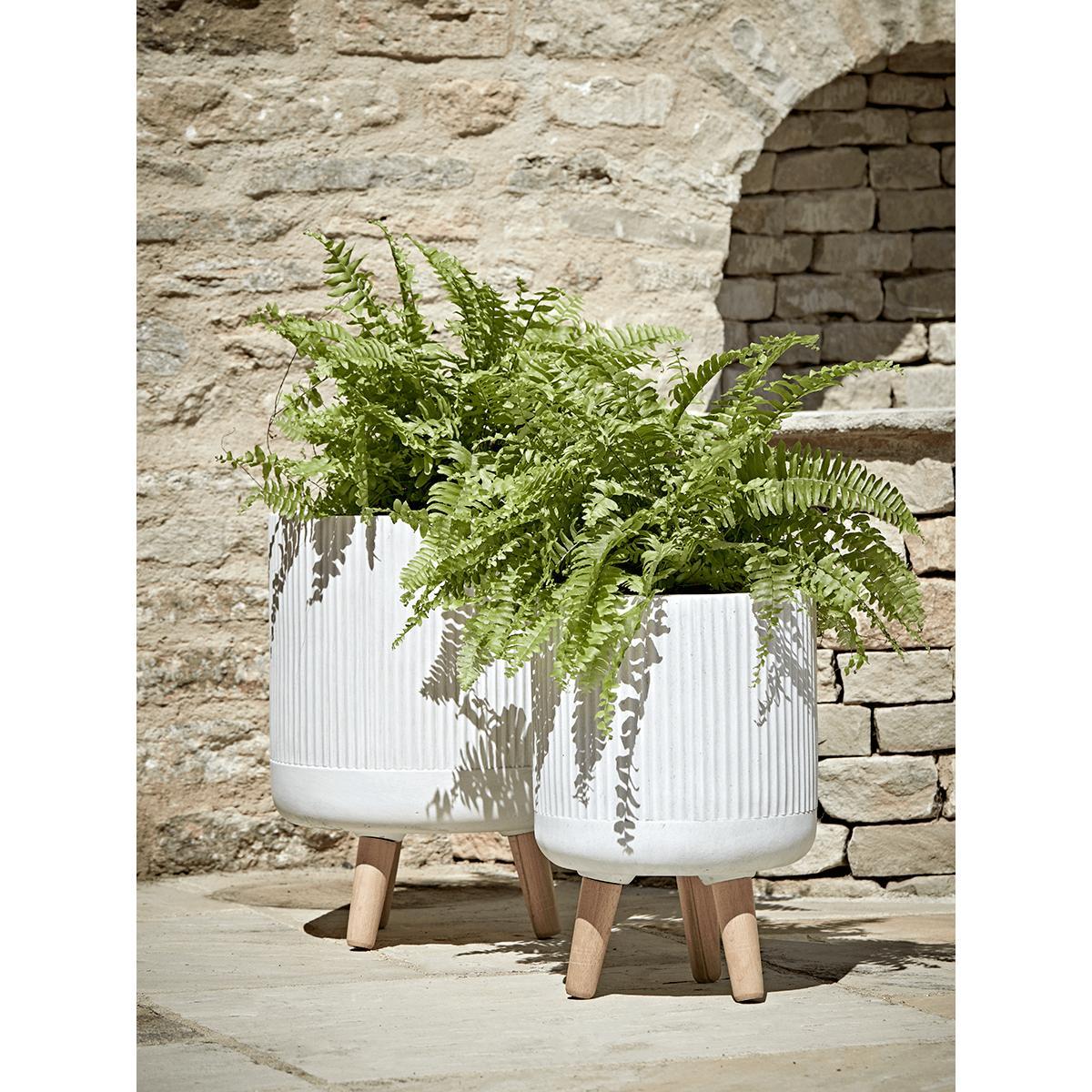 Standing on three weatherproof, pale wood legs, with a contemporary, etched vertical stripe design to the surface, our set of two pale grey planters will accent your garden in the most stylish way. Each set features one large and one medium-sized planter, perfect for housing your favourite shrubs and flowers.