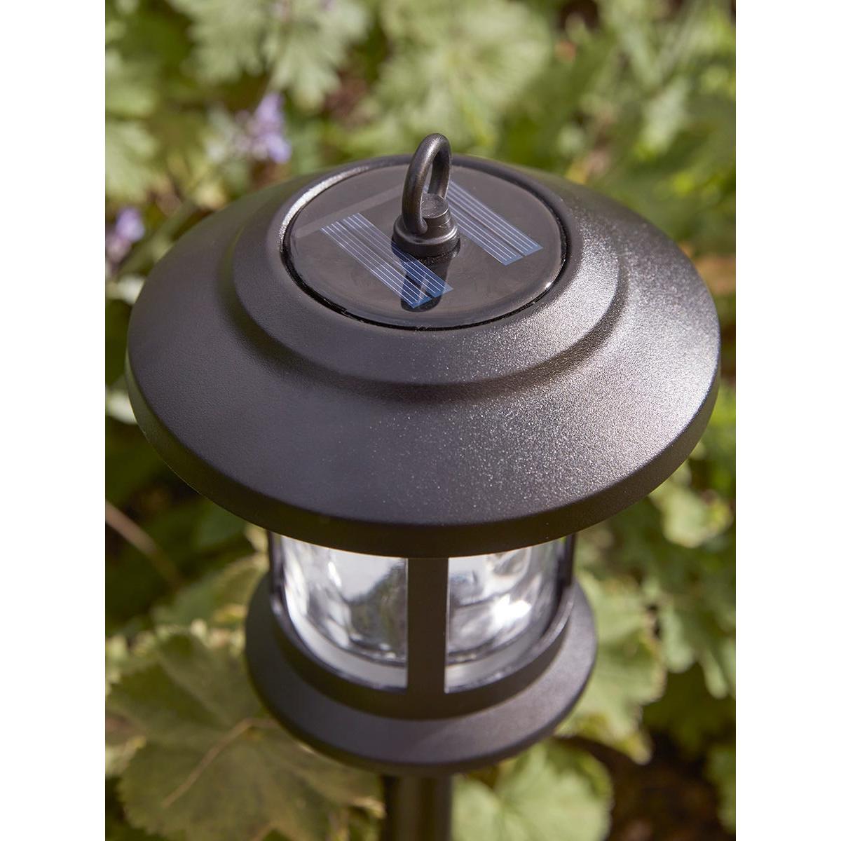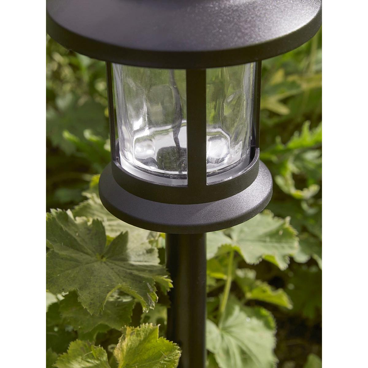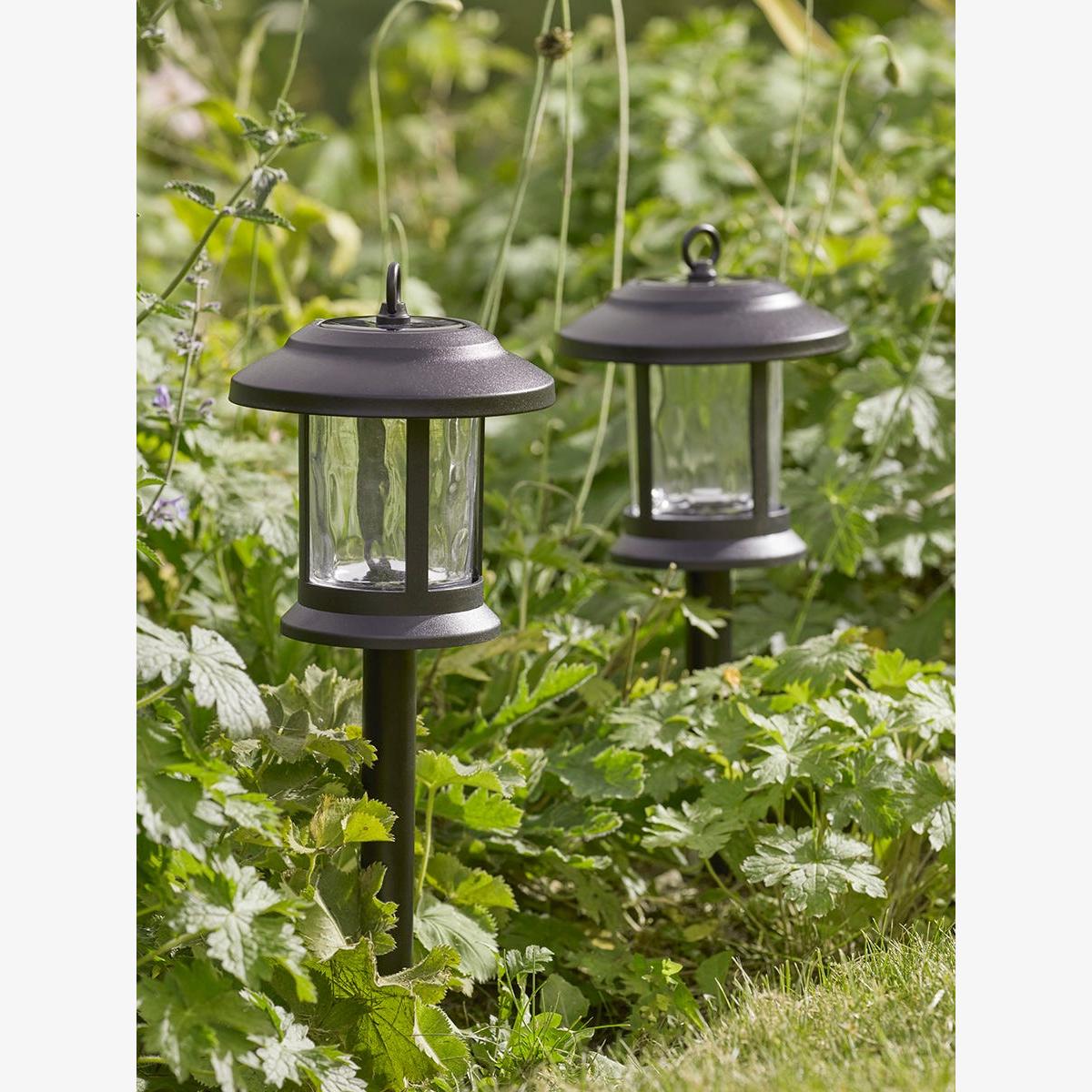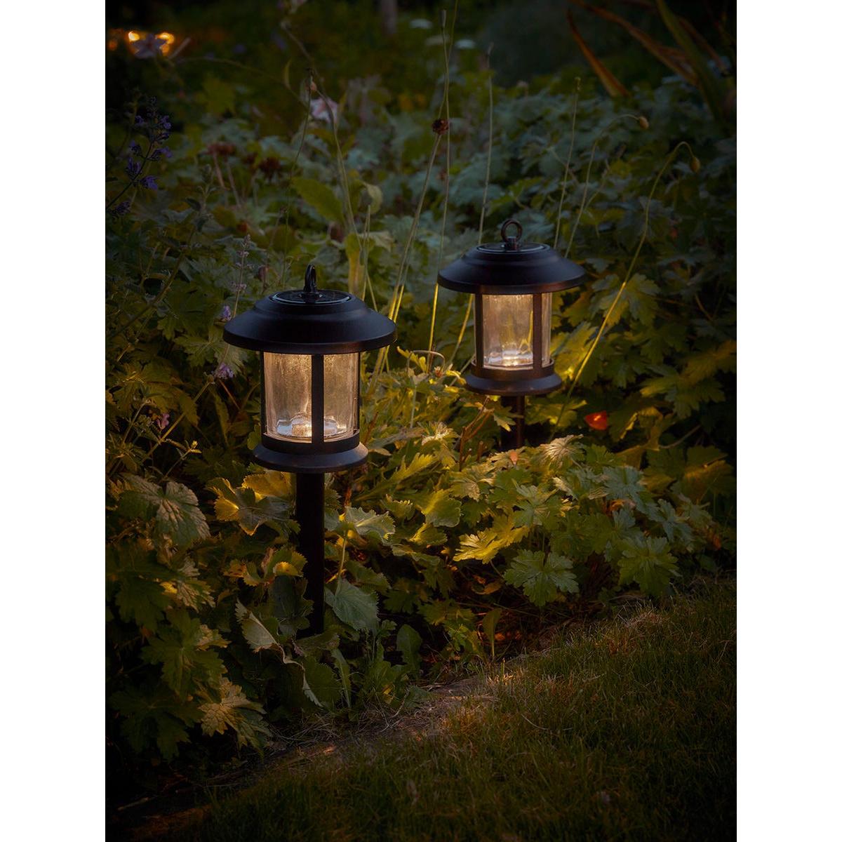 Our Texture Glass Stake Lights are a stylish and versatile addition to any garden, large or small. The classic lantern shape, in matte black, is embellished with dimpled clear glass panels which will gently diffuse the light. Choose to submerge them into the lawn or soil to light your borders and pathways. Alternatively, the lantern can be detached from the stake and you can hang the lights using the ring, or place them as table lamps. Available in pairs.