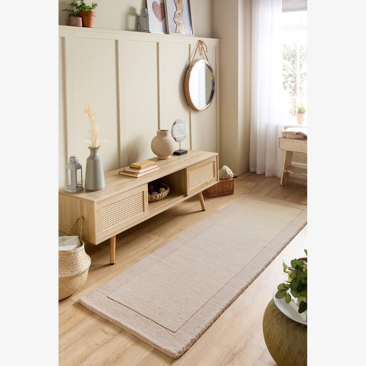 I love the two tone border plain runner because it brings a subtle touch of texture and visual interest without overwhelming a space. It's versatile enough to work well in both modern and traditional interiors, especially those with a neutral or minimalist palette. I recommend pairing it with light wood furniture and soft furnishings to create a calm, cohesive look. Practical styling tips include layering it with other textured textiles, like cushions or throws, to add depth, and leaving it slightly folded or asymmetrical at the edges for a relaxed, lived-in feel. Its wool material makes it a warm and comfortable option, perfect for hallways or living rooms where comfort is key.