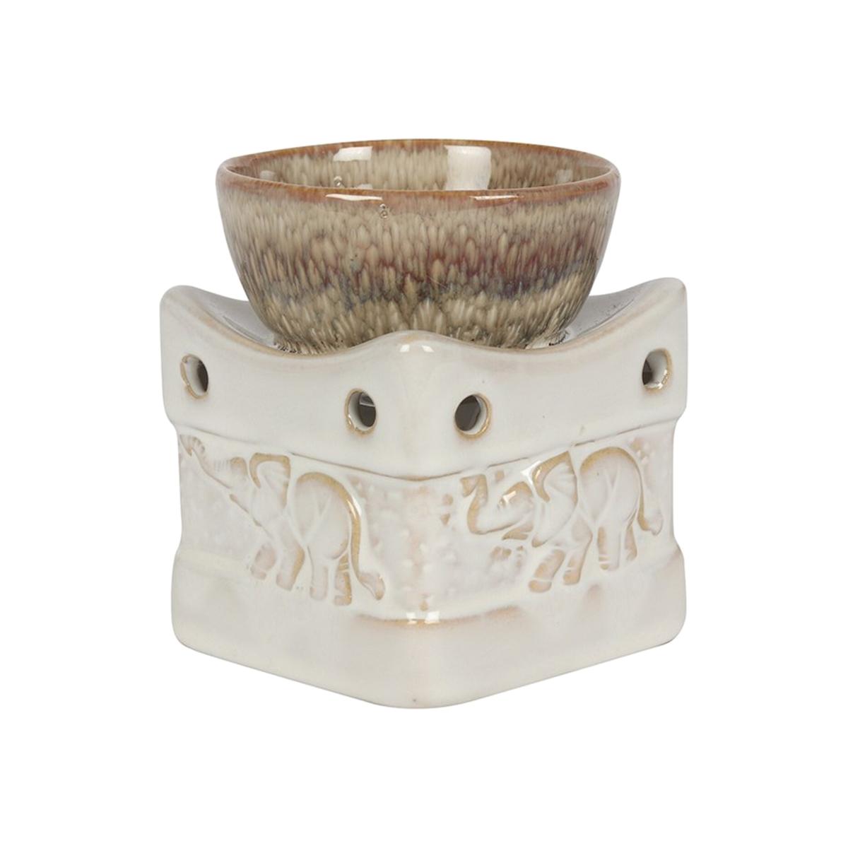 A glazed ceramic oil burner with elephant designs and a two tone cream and green effect. This item can also be used as a wax melt burner however it is advisable to consider the size and depth of the bowl when adding wax to ensure it will not overrun the edges when melted.