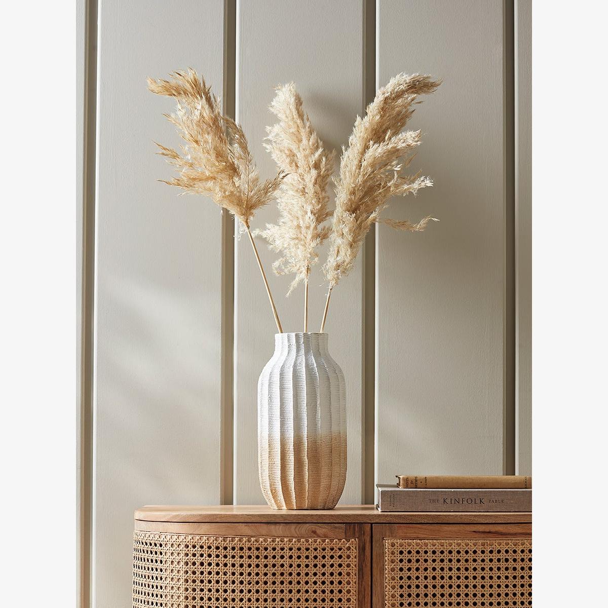 I really like this two-tone textured vase for its subtle yet modern take on classic vessel design. It works well in both minimalist and boho interiors, adding visual interest without overwhelming the space. To style it effectively, I’d suggest pairing it with neutral-toned dried flowers or pampas grass, as seen in the image, which enhances its earthy, understated appeal. You can also elevate an everyday shelf or console by placing it alongside smaller decorative objects or books to create a layered, curated look. Its muted tones and tactile surface make it versatile, perfect for bringing a touch of warmth and texture to any contemporary or Scandinavian-inspired interior.