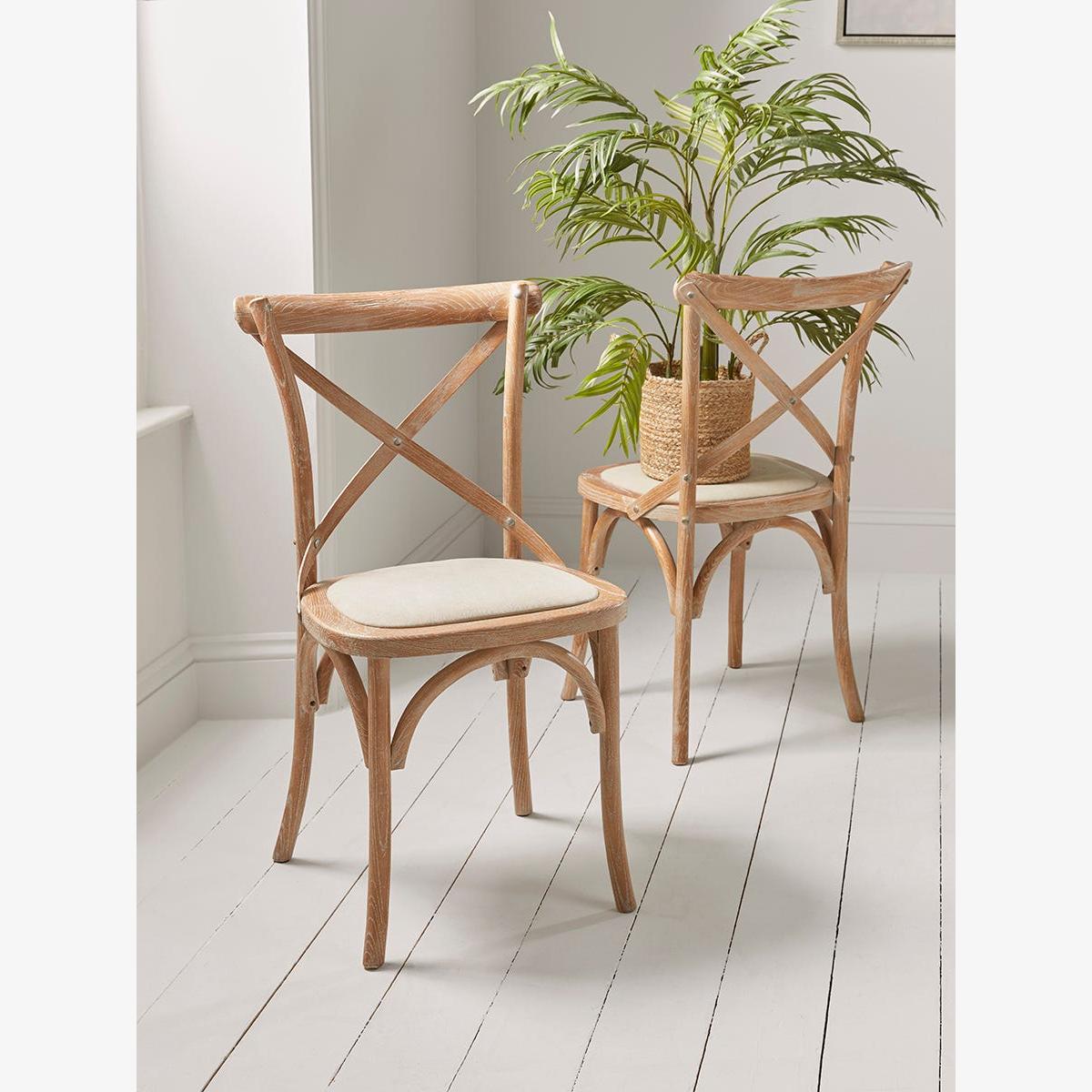 In lovely muted tones that will seem like they’ve been part of your home for years, our Wooden Cross Back Chairs are full of relaxed charm. This pair of chairs is made with classic bentwood styling from lovingly aged natural oak with a lightly lime-washed finish. A simple cross back design is allied with gently curved legs and seat pads in a neutral linen for effortless elegance.