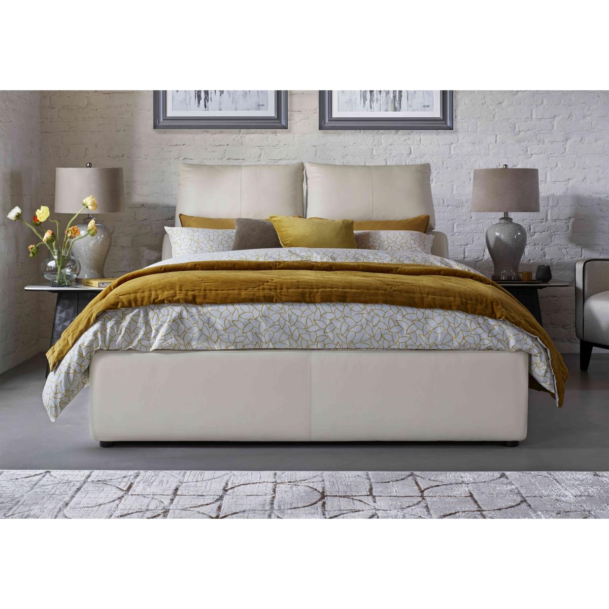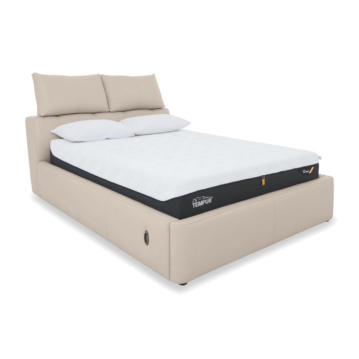Give your bedroom a contemporary style makeover and treat yourself to spacious extra bedroom storage. Showcasing a fabulous headboard design – double pillow-style headrests that are independently adjustable for perfect-position comfort – the sturdy ottoman bed frames in the Tyrell collection feature maximum-capacity underbed storage spaces. Choose either manual or electric ottoman mechanisms and beautifully tailored upholstery in 100% leather or fabric. The range also includes stylish blanket boxes which double as bedroom seating as well as providing handy extra storage. The Tyrell range is exclusively available at Furniture Village. This luxurious leather electric ottoman bed frame combines fabulous contemporary style – that pillow-style headboard – with perfect-position adjustable headrests. Only at Furniture Village. Upgrade your bedroom style – and your bedroom storage. Contemporary ottoman bed frame has perfect-position comfort built in. Luxurious pillow-style headrest cushions can be moved up and down. Electric-powered ottoman base is effortlessly easy to open and close. Enjoy maximum capacity storage – the underbed compartment is as large as the bed frame. Perfect for lightweight items like duvets, pillows and clothing. Simple touch-button controls with safety locking feature and a USB port. Well-crafted and sturdy. A slatted wood base offers great mattress support. Beautiful 100% leather upholstery in an incredibly wide choice of on-trend colours. In king and super king bed sizes. A Furniture Village exclusive. This leather electric ottoman bed frame is part of our Tyrell range. What you need to know Mattress sold separately. Maximum mattress weight is 80 kg for both king and super king bed frames. Please keep hands clear of the mechanism when opening and closing the ottoman. Do not sit on the foot end of this ottoman bed frame when opening. Leather has unique marks and characteristics with variation in colour and texture. Leather softens with use. Deal with any spills promptly. Professional cleaning advised for oil- and grease-based stains.