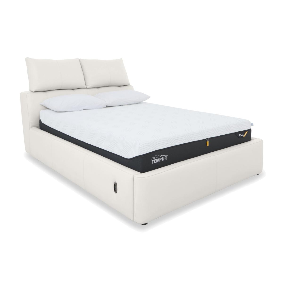 Give your bedroom a contemporary style makeover and treat yourself to spacious extra bedroom storage. Showcasing a fabulous headboard design – double pillow-style headrests that are independently adjustable for perfect-position comfort – the sturdy ottoman bed frames in the Tyrell collection feature maximum-capacity underbed storage spaces. Choose either manual or electric ottoman mechanisms and beautifully tailored upholstery in 100% leather or fabric. The range also includes stylish blanket boxes which double as bedroom seating as well as providing handy extra storage. The Tyrell range is exclusively available at Furniture Village. This luxurious leather electric ottoman bed frame combines fabulous contemporary style – that pillow-style headboard – with perfect-position adjustable headrests. Only at Furniture Village. Upgrade your bedroom style – and your bedroom storage. Contemporary ottoman bed frame has perfect-position comfort built in. Luxurious pillow-style headrest cushions can be moved up and down. Electric-powered ottoman base is effortlessly easy to open and close. Enjoy maximum capacity storage – the underbed compartment is as large as the bed frame. Perfect for lightweight items like duvets, pillows and clothing. Simple touch-button controls with safety locking feature and a USB port. Well-crafted and sturdy. A slatted wood base offers great mattress support. Beautiful 100% leather upholstery in an incredibly wide choice of on-trend colours. In king and super king bed sizes. A Furniture Village exclusive. This leather electric ottoman bed frame is part of our Tyrell range. What you need to know Mattress sold separately. Maximum mattress weight is 80 kg for both king and super king bed frames. Please keep hands clear of the mechanism when opening and closing the ottoman. Do not sit on the foot end of this ottoman bed frame when opening. Leather has unique marks and characteristics with variation in colour and texture. Leather softens with use. Deal with any spills promptly. Professional cleaning advised for oil- and grease-based stains.