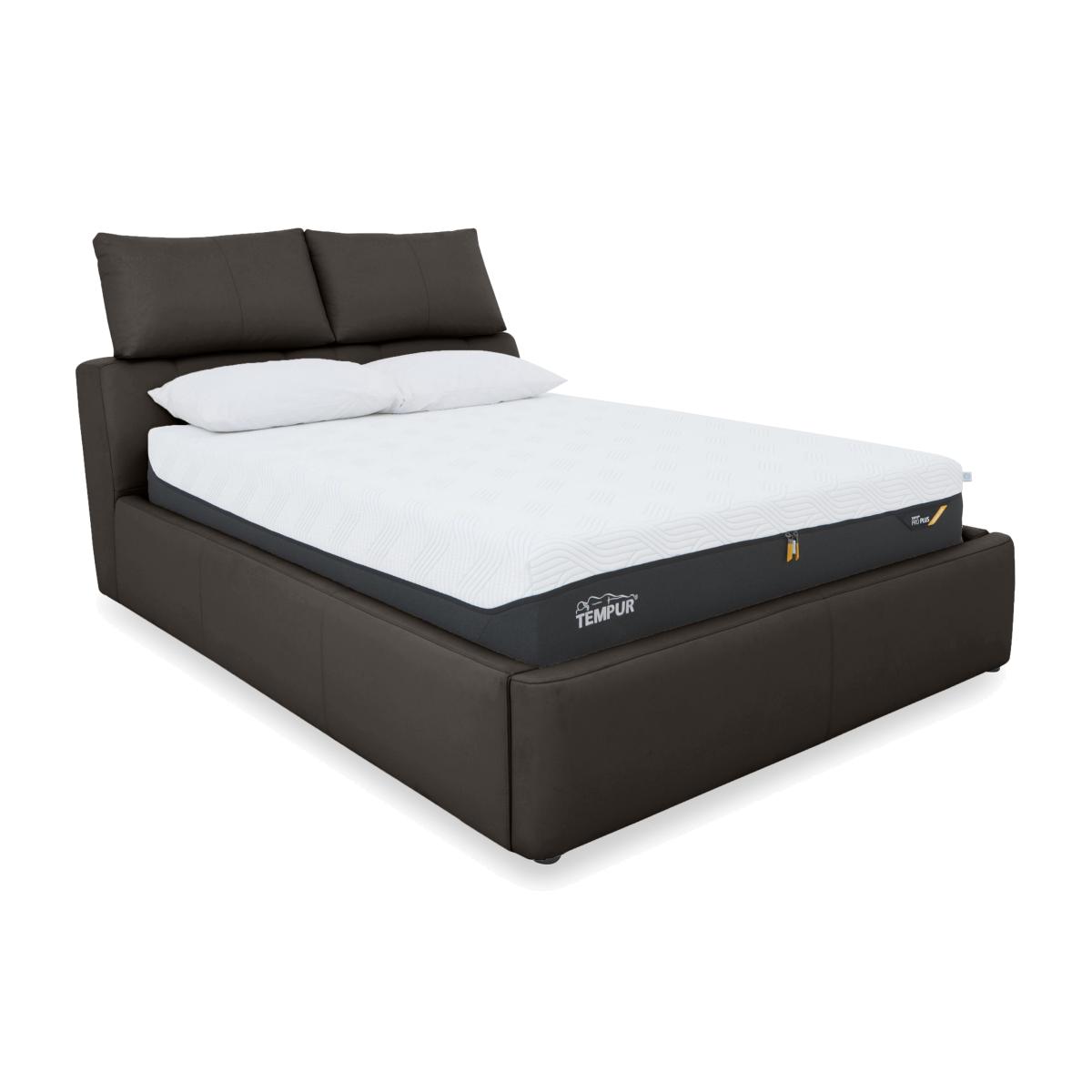 Give your bedroom a contemporary style makeover and treat yourself to spacious extra bedroom storage. Showcasing a fabulous headboard design – double pillow-style headrests that are independently adjustable for perfect-position comfort – the sturdy ottoman bed frames in the Tyrell collection feature maximum-capacity underbed storage spaces. Choose either manual or electric ottoman mechanisms and beautifully tailored upholstery in 100% leather or fabric. The range also includes stylish blanket boxes which double as bedroom seating as well as providing handy extra storage. The Tyrell range is exclusively available at Furniture Village. This leather end-lift ottoman bed base makes relaxing in bed so easy thanks to its adjustable headrest cushions. And the large hidden storage space will keep your bedroom looking tidy. Why you'll love it Upgrade your bedroom style – and your bedroom storage. Contemporary ottoman bed frame has perfect-position comfort built in. Luxurious pillow-style headrest cushions can be moved up and down. Sprung-mechanism ottoman base with locking feature is easy and safe to open and close. Enjoy maximum capacity storage – the underbed compartment is as large as the bed frame. Perfect for lightweight items like duvets, pillows and clothing. Well-crafted and sturdy. A slatted wood base offers great mattress support. Beautiful 100% leather upholstery in an incredibly wide choice of on-trend colours. In king and super king bed sizes. A Furniture Village exclusive. This leather manual ottoman bed frame is part of our Tyrell range. What you need to know Mattress sold separately. Maximum mattress weight is 80 kg for both king and super king bed frames. Please keep hands clear of the mechanism when opening and closing the ottoman. Do not sit on the foot end of this ottoman bed frame when opening. Leather has unique marks and characteristics with variation in colour and texture. Leather softens with use. Deal with any spills promptly. Professional cleaning advised for oil- and grease-based stains.