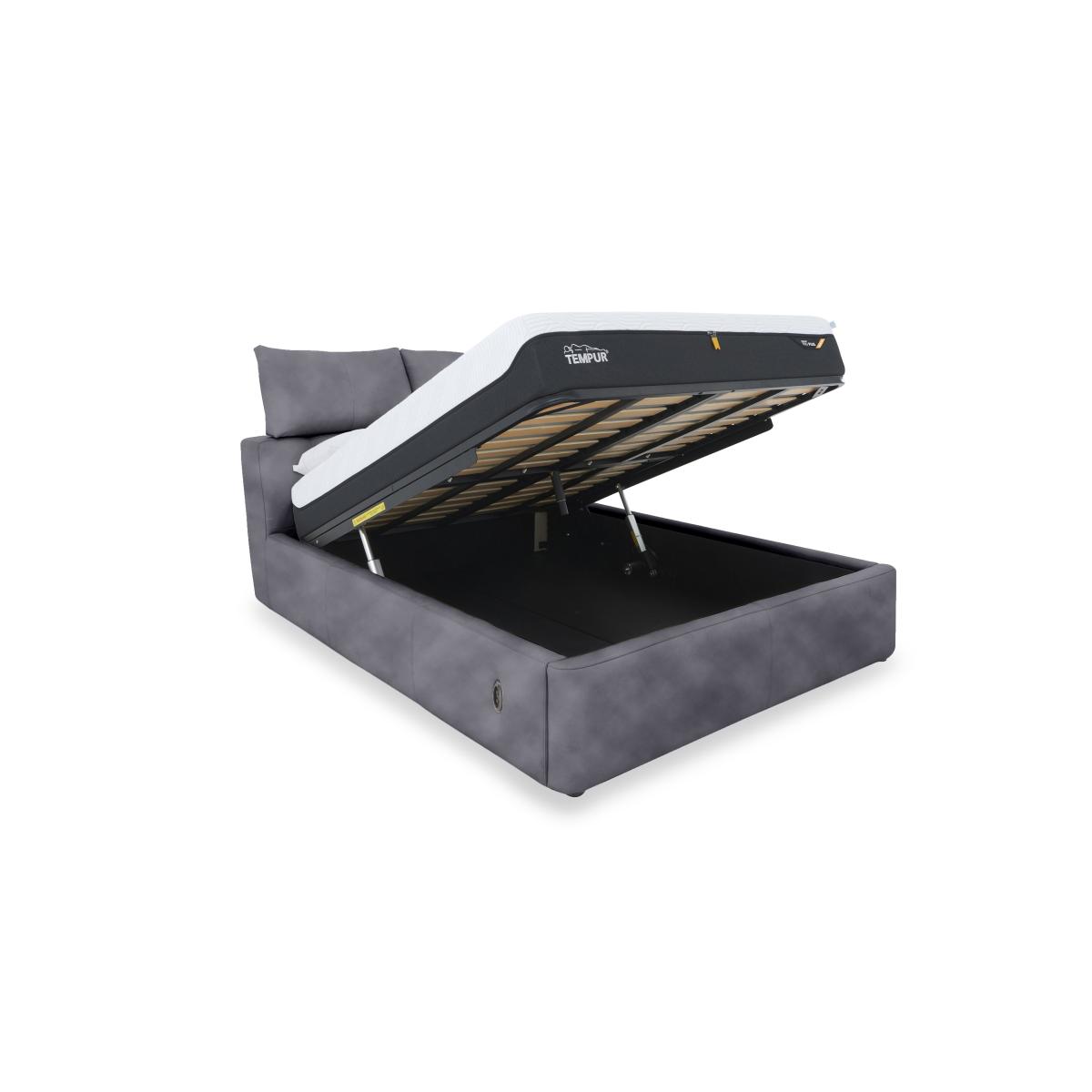 Give your bedroom a contemporary style makeover and treat yourself to spacious extra bedroom storage. Showcasing a fabulous headboard design – double pillow-style headrests that are independently adjustable for perfect-position comfort – the sturdy ottoman bed frames in the Tyrell collection feature maximum-capacity underbed storage spaces. Choose either manual or electric ottoman mechanisms and beautifully tailored upholstery in 100% leather or fabric. The range also includes stylish blanket boxes which double as bedroom seating as well as providing handy extra storage. The Tyrell range is exclusively available at Furniture Village. With adjustable pillow-style headrests, an electric-powered storage base and beautiful fabric upholstery, this ottoman bed frame is the last word in style with storage. Only at Furniture Village. Why you'll love it Upgrade your bedroom style – and your bedroom storage. Contemporary ottoman bed frame has perfect-position comfort built in. Luxurious pillow-style headrest cushions can be moved up and down. Electric-powered ottoman base is effortlessly easy to open and close. Enjoy maximum capacity storage – the underbed compartment is as large as the bed frame. Perfect for lightweight items like duvets, pillows and clothing. Simple touch-button controls with safety locking feature and a USB port. Well-crafted and sturdy. A slatted wood base offers great mattress support. Beautiful fabric upholstery in an incredibly wide choice of on-trend colours. Also available with 100% leather upholstery. In king and super king bed sizes. A Furniture Village exclusive. This fabric electric ottoman bed frame is part of our Tyrell range. What you need to know Mattress sold separately. Maximum mattress weight is 80 kg for both king and super king bed frames. Please keep hands clear of the mechanism when opening and closing the ottoman. Do not sit on the foot end of this ottoman bed frame when opening. Clean regularly using a soft brush or vacuum with the curtain attachment. Deal with any spills promptly. Professional cleaning advised for oil- and grease-based stains. Some fabrics can show wear on areas of more use or in direct sunlight.