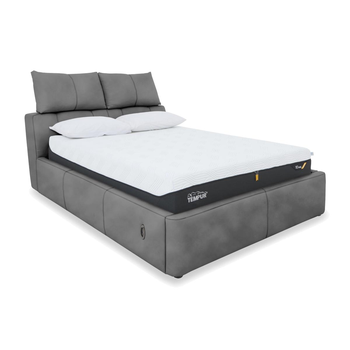 Give your bedroom a contemporary style makeover and treat yourself to spacious extra bedroom storage. Showcasing a fabulous headboard design – double pillow-style headrests that are independently adjustable for perfect-position comfort – the sturdy ottoman bed frames in the Tyrell collection feature maximum-capacity underbed storage spaces. Choose either manual or electric ottoman mechanisms and beautifully tailored upholstery in 100% leather or fabric. The range also includes stylish blanket boxes which double as bedroom seating as well as providing handy extra storage. The Tyrell range is exclusively available at Furniture Village. With adjustable pillow-style headrests, an electric-powered storage base and beautiful fabric upholstery, this ottoman bed frame is the last word in style with storage. Only at Furniture Village. Why you'll love it Upgrade your bedroom style – and your bedroom storage. Contemporary ottoman bed frame has perfect-position comfort built in. Luxurious pillow-style headrest cushions can be moved up and down. Electric-powered ottoman base is effortlessly easy to open and close. Enjoy maximum capacity storage – the underbed compartment is as large as the bed frame. Perfect for lightweight items like duvets, pillows and clothing. Simple touch-button controls with safety locking feature and a USB port. Well-crafted and sturdy. A slatted wood base offers great mattress support. Beautiful fabric upholstery in an incredibly wide choice of on-trend colours. Also available with 100% leather upholstery. In king and super king bed sizes. A Furniture Village exclusive. This fabric electric ottoman bed frame is part of our Tyrell range. What you need to know Mattress sold separately. Maximum mattress weight is 80 kg for both king and super king bed frames. Please keep hands clear of the mechanism when opening and closing the ottoman. Do not sit on the foot end of this ottoman bed frame when opening. Clean regularly using a soft brush or vacuum with the curtain attachment. Deal with any spills promptly. Professional cleaning advised for oil- and grease-based stains. Some fabrics can show wear on areas of more use or in direct sunlight.