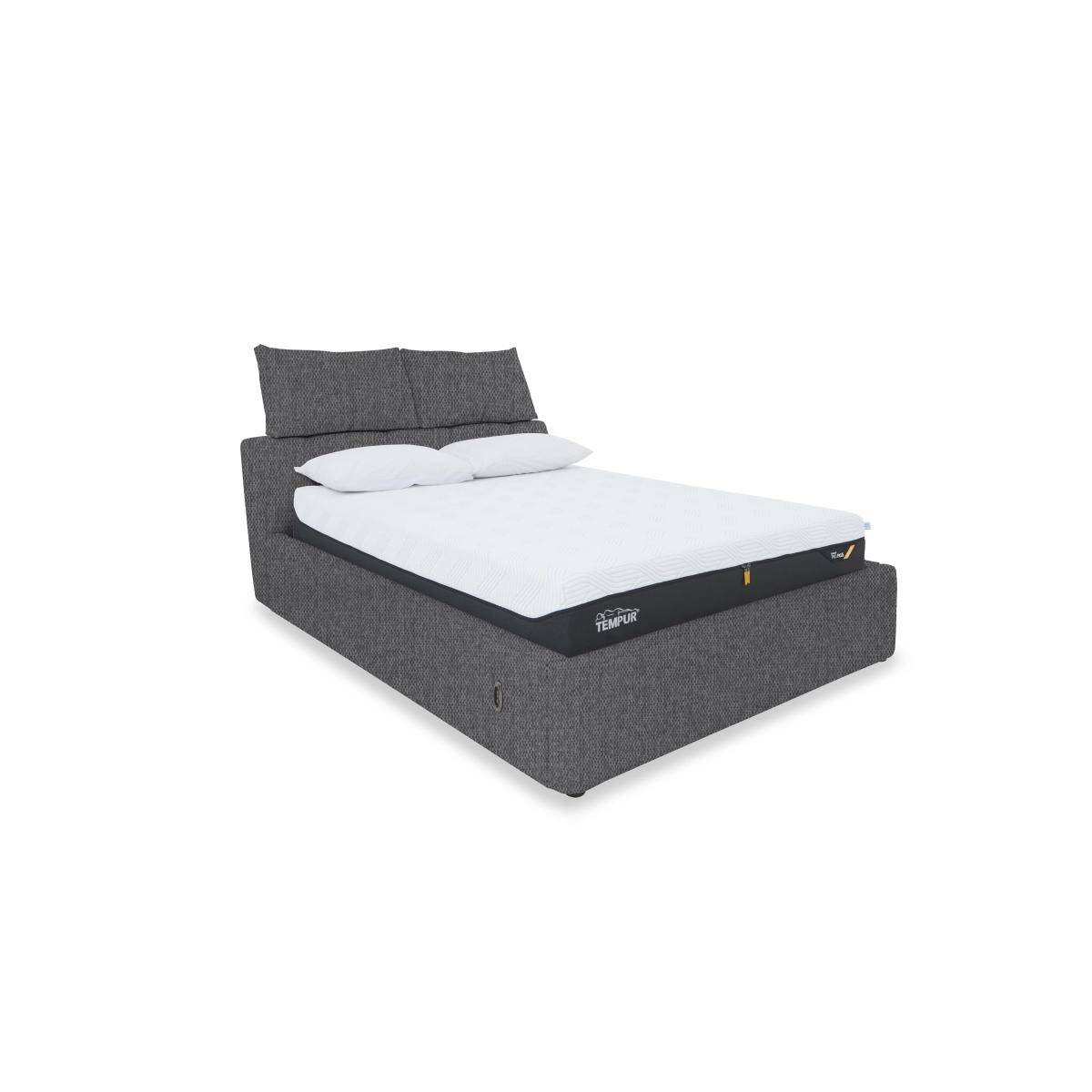 Give your bedroom a contemporary style makeover and treat yourself to spacious extra bedroom storage. Showcasing a fabulous headboard design – double pillow-style headrests that are independently adjustable for perfect-position comfort – the sturdy ottoman bed frames in the Tyrell collection feature maximum-capacity underbed storage spaces. Choose either manual or electric ottoman mechanisms and beautifully tailored upholstery in 100% leather or fabric. The range also includes stylish blanket boxes which double as bedroom seating as well as providing handy extra storage. The Tyrell range is exclusively available at Furniture Village. With adjustable pillow-style headrests, an electric-powered storage base and beautiful fabric upholstery, this ottoman bed frame is the last word in style with storage. Only at Furniture Village. Why you'll love it Upgrade your bedroom style – and your bedroom storage. Contemporary ottoman bed frame has perfect-position comfort built in. Luxurious pillow-style headrest cushions can be moved up and down. Electric-powered ottoman base is effortlessly easy to open and close. Enjoy maximum capacity storage – the underbed compartment is as large as the bed frame. Perfect for lightweight items like duvets, pillows and clothing. Simple touch-button controls with safety locking feature and a USB port. Well-crafted and sturdy. A slatted wood base offers great mattress support. Beautiful fabric upholstery in an incredibly wide choice of on-trend colours. Also available with 100% leather upholstery. In king and super king bed sizes. A Furniture Village exclusive. This fabric electric ottoman bed frame is part of our Tyrell range. What you need to know Mattress sold separately. Maximum mattress weight is 80 kg for both king and super king bed frames. Please keep hands clear of the mechanism when opening and closing the ottoman. Do not sit on the foot end of this ottoman bed frame when opening. Clean regularly using a soft brush or vacuum with the curtain attachment. Deal with any spills promptly. Professional cleaning advised for oil- and grease-based stains. Some fabrics can show wear on areas of more use or in direct sunlight.