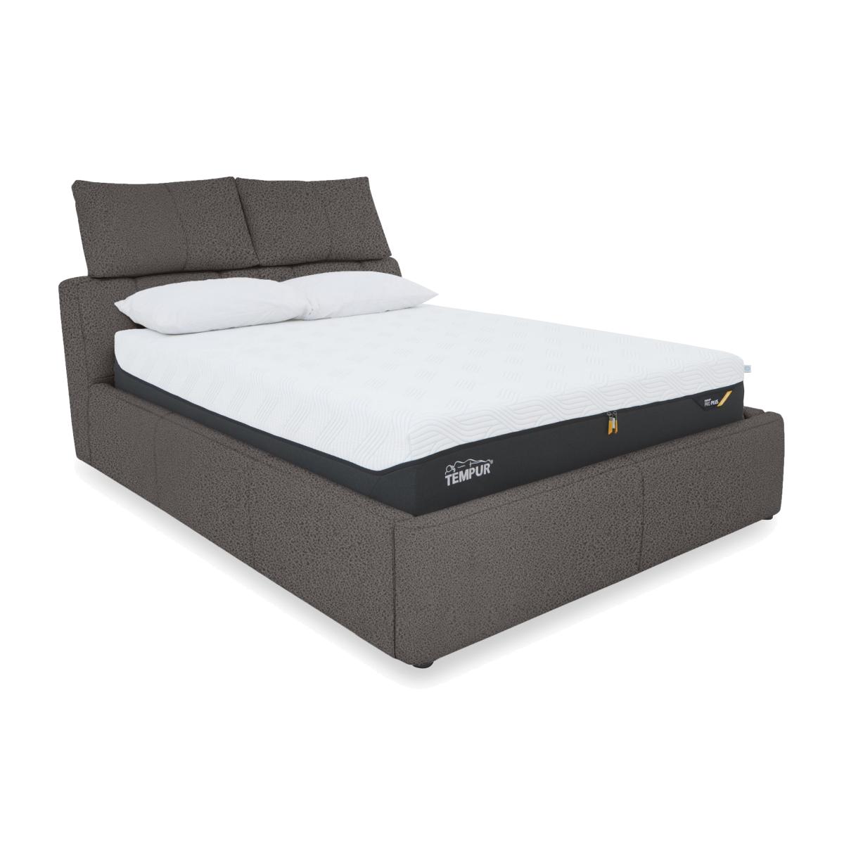 Give your bedroom a contemporary style makeover and treat yourself to spacious extra bedroom storage. Showcasing a fabulous headboard design – double pillow-style headrests that are independently adjustable for perfect-position comfort – the sturdy ottoman bed frames in the Tyrell collection feature maximum-capacity underbed storage spaces. Choose either manual or electric ottoman mechanisms and beautifully tailored upholstery in 100% leather or fabric. The range also includes stylish blanket boxes which double as bedroom seating as well as providing handy extra storage. The Tyrell range is exclusively available at Furniture Village. Enjoy more bedroom storage with this stunning ottoman bed frame. The pillow-style headrest cushions are independently adjustable. Available in a huge choice of fabrics. Why you'll love it Upgrade your bedroom style – and your bedroom storage. Contemporary ottoman bed frame has perfect-position comfort built in. Luxurious pillow-style headrest cushions can be moved up and down. Sprung-mechanism ottoman base with locking feature is easy and safe to open and close. Enjoy maximum capacity storage – the underbed compartment is as large as the bed frame. Perfect for lightweight items like duvets, pillows and clothing. Well-crafted and sturdy. A slatted wood base offers great mattress support. Beautiful fabric upholstery in an incredibly wide choice of on-trend colours. Also available with 100% leather upholstery. In king and super king bed sizes. A Furniture Village exclusive. This fabric manual ottoman bed frame is part of our Tyrell range. What you need to know Mattress sold separately. Maximum mattress weight is 80 kg for both king and super king bed frames. Please keep hands clear of the mechanism when opening and closing the ottoman. Do not sit on the foot end of this ottoman bed frame when opening. Clean regularly using a soft brush or vacuum with the curtain attachment. Deal with any spills promptly. Professional cleaning advised for oil- and grease-based stains. Some fabrics can show wear on areas of more use or in direct sunlight.