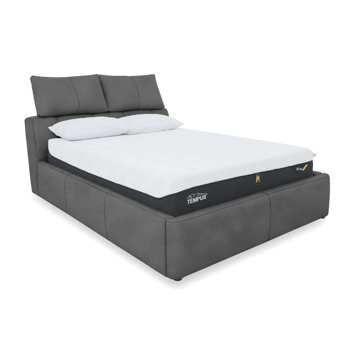 Give your bedroom a contemporary style makeover and treat yourself to spacious extra bedroom storage. Showcasing a fabulous headboard design – double pillow-style headrests that are independently adjustable for perfect-position comfort – the sturdy ottoman bed frames in the Tyrell collection feature maximum-capacity underbed storage spaces. Choose either manual or electric ottoman mechanisms and beautifully tailored upholstery in 100% leather or fabric. The range also includes stylish blanket boxes which double as bedroom seating as well as providing handy extra storage. The Tyrell range is exclusively available at Furniture Village. Enjoy more bedroom storage with this stunning ottoman bed frame. The pillow-style headrest cushions are independently adjustable. Available in a huge choice of fabrics. Why you'll love it Upgrade your bedroom style – and your bedroom storage. Contemporary ottoman bed frame has perfect-position comfort built in. Luxurious pillow-style headrest cushions can be moved up and down. Sprung-mechanism ottoman base with locking feature is easy and safe to open and close. Enjoy maximum capacity storage – the underbed compartment is as large as the bed frame. Perfect for lightweight items like duvets, pillows and clothing. Well-crafted and sturdy. A slatted wood base offers great mattress support. Beautiful fabric upholstery in an incredibly wide choice of on-trend colours. Also available with 100% leather upholstery. In king and super king bed sizes. A Furniture Village exclusive. This fabric manual ottoman bed frame is part of our Tyrell range. What you need to know Mattress sold separately. Maximum mattress weight is 80 kg for both king and super king bed frames. Please keep hands clear of the mechanism when opening and closing the ottoman. Do not sit on the foot end of this ottoman bed frame when opening. Clean regularly using a soft brush or vacuum with the curtain attachment. Deal with any spills promptly. Professional cleaning advised for oil- and grease-based stains. Some fabrics can show wear on areas of more use or in direct sunlight.