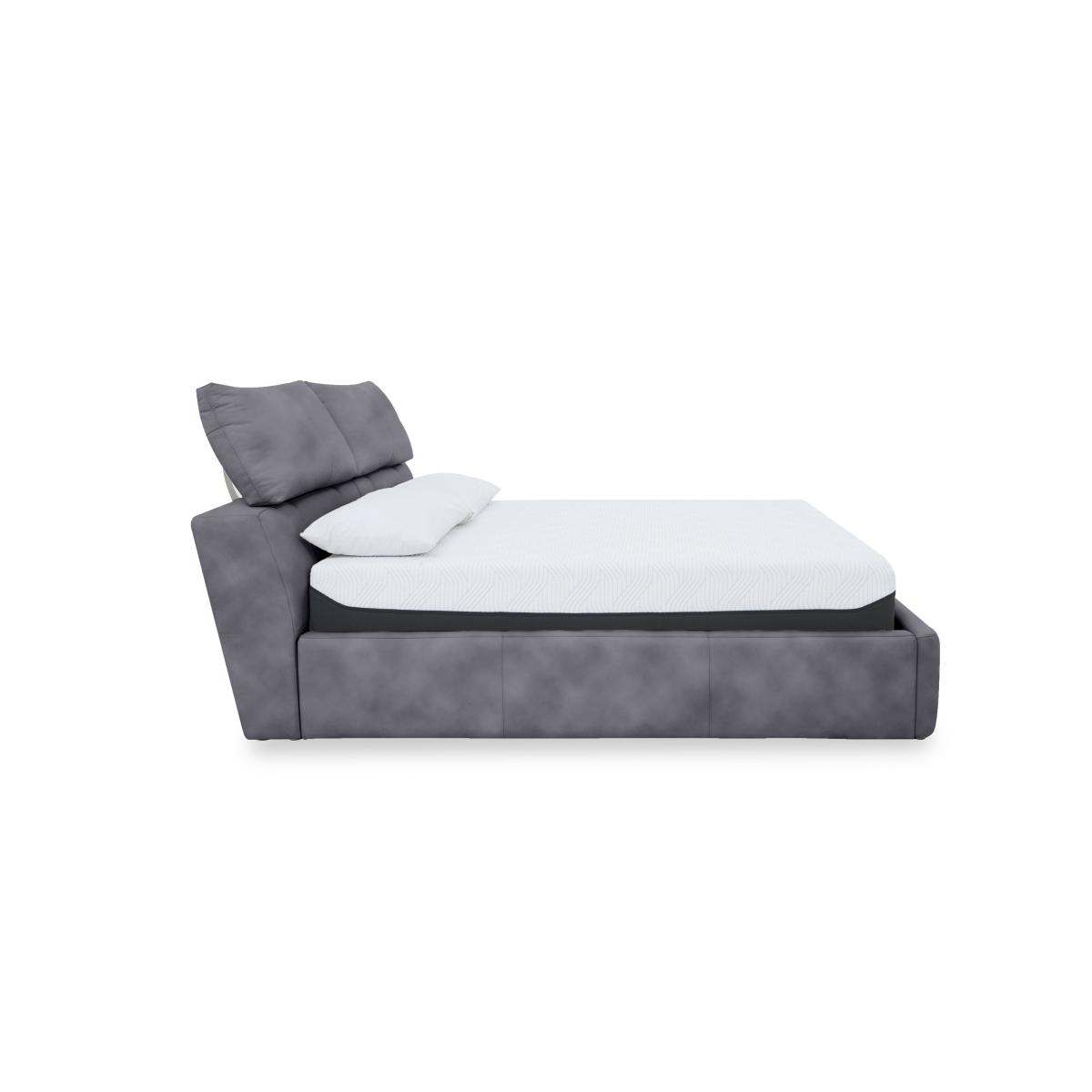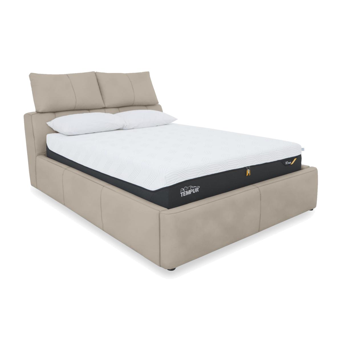 Give your bedroom a contemporary style makeover and treat yourself to spacious extra bedroom storage. Showcasing a fabulous headboard design – double pillow-style headrests that are independently adjustable for perfect-position comfort – the sturdy ottoman bed frames in the Tyrell collection feature maximum-capacity underbed storage spaces. Choose either manual or electric ottoman mechanisms and beautifully tailored upholstery in 100% leather or fabric. The range also includes stylish blanket boxes which double as bedroom seating as well as providing handy extra storage. The Tyrell range is exclusively available at Furniture Village. Enjoy more bedroom storage with this stunning ottoman bed frame. The pillow-style headrest cushions are independently adjustable. Available in a huge choice of fabrics. Why you'll love it Upgrade your bedroom style – and your bedroom storage. Contemporary ottoman bed frame has perfect-position comfort built in. Luxurious pillow-style headrest cushions can be moved up and down. Sprung-mechanism ottoman base with locking feature is easy and safe to open and close. Enjoy maximum capacity storage – the underbed compartment is as large as the bed frame. Perfect for lightweight items like duvets, pillows and clothing. Well-crafted and sturdy. A slatted wood base offers great mattress support. Beautiful fabric upholstery in an incredibly wide choice of on-trend colours. Also available with 100% leather upholstery. In king and super king bed sizes. A Furniture Village exclusive. This fabric manual ottoman bed frame is part of our Tyrell range. What you need to know Mattress sold separately. Maximum mattress weight is 80 kg for both king and super king bed frames. Please keep hands clear of the mechanism when opening and closing the ottoman. Do not sit on the foot end of this ottoman bed frame when opening. Clean regularly using a soft brush or vacuum with the curtain attachment. Deal with any spills promptly. Professional cleaning advised for oil- and grease-based stains. Some fabrics can show wear on areas of more use or in direct sunlight.