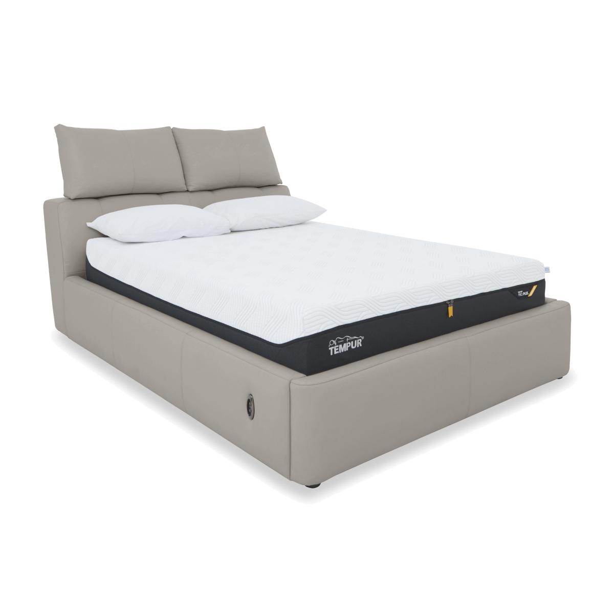 Give your bedroom a contemporary style makeover and treat yourself to spacious extra bedroom storage. Showcasing a fabulous headboard design – double pillow-style headrests that are independently adjustable for perfect-position comfort – the sturdy ottoman bed frames in the Tyrell collection feature maximum-capacity underbed storage spaces. Choose either manual or electric ottoman mechanisms and beautifully tailored upholstery in 100% leather or fabric. The range also includes stylish blanket boxes which double as bedroom seating as well as providing handy extra storage. The Tyrell range is exclusively available at Furniture Village. This luxurious leather electric ottoman bed frame combines fabulous contemporary style – that pillow-style headboard – with perfect-position adjustable headrests. Only at Furniture Village. Upgrade your bedroom style – and your bedroom storage. Contemporary ottoman bed frame has perfect-position comfort built in. Luxurious pillow-style headrest cushions can be moved up and down. Electric-powered ottoman base is effortlessly easy to open and close. Enjoy maximum capacity storage – the underbed compartment is as large as the bed frame. Perfect for lightweight items like duvets, pillows and clothing. Simple touch-button controls with safety locking feature and a USB port. Well-crafted and sturdy. A slatted wood base offers great mattress support. Beautiful 100% leather upholstery in an incredibly wide choice of on-trend colours. In king and super king bed sizes. A Furniture Village exclusive. This leather electric ottoman bed frame is part of our Tyrell range. What you need to know Mattress sold separately. Maximum mattress weight is 80 kg for both king and super king bed frames. Please keep hands clear of the mechanism when opening and closing the ottoman. Do not sit on the foot end of this ottoman bed frame when opening. Leather has unique marks and characteristics with variation in colour and texture. Leather softens with use. Deal with any spills promptly. Professional cleaning advised for oil- and grease-based stains.