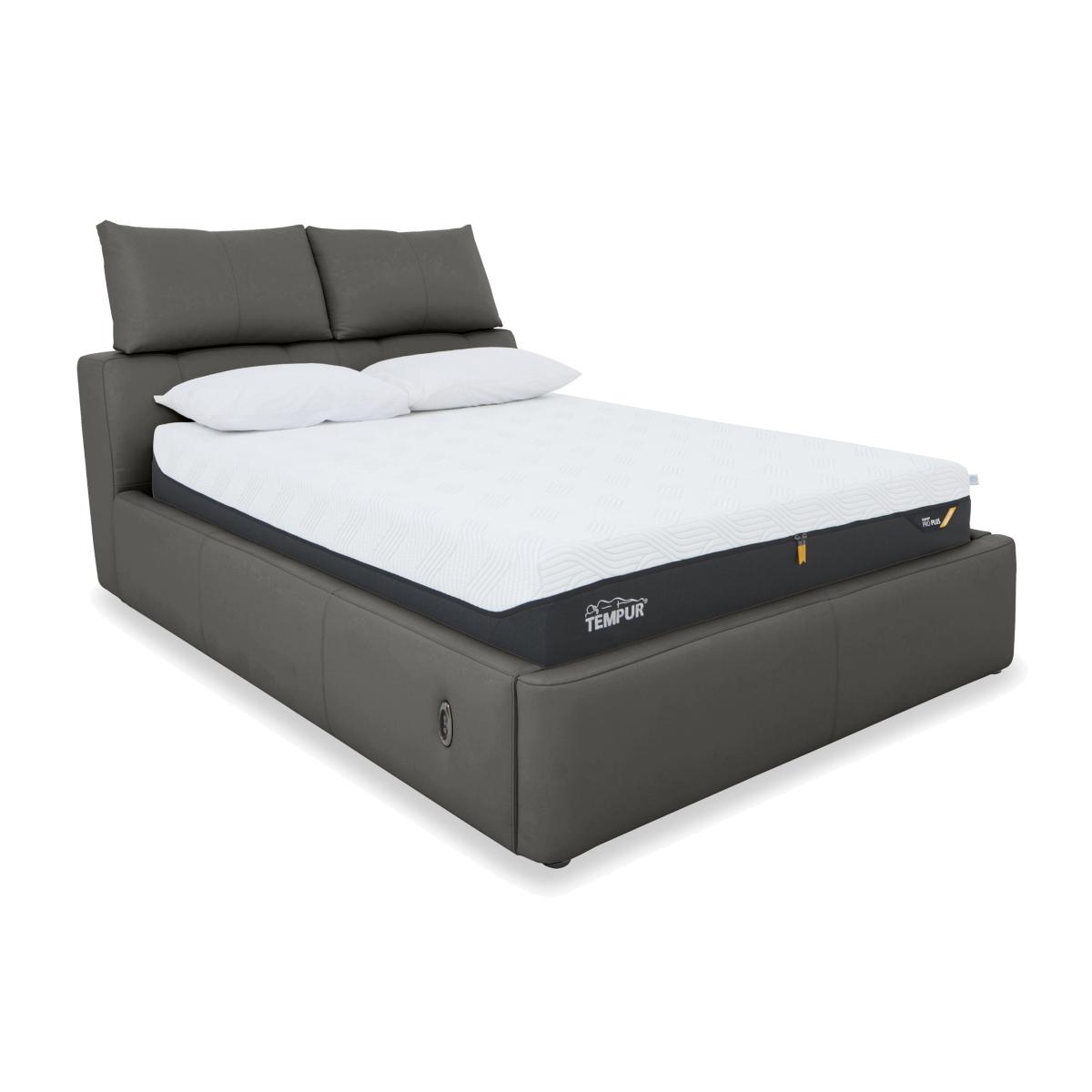 Give your bedroom a contemporary style makeover and treat yourself to spacious extra bedroom storage. Showcasing a fabulous headboard design – double pillow-style headrests that are independently adjustable for perfect-position comfort – the sturdy ottoman bed frames in the Tyrell collection feature maximum-capacity underbed storage spaces. Choose either manual or electric ottoman mechanisms and beautifully tailored upholstery in 100% leather or fabric. The range also includes stylish blanket boxes which double as bedroom seating as well as providing handy extra storage. The Tyrell range is exclusively available at Furniture Village. This luxurious leather electric ottoman bed frame combines fabulous contemporary style – that pillow-style headboard – with perfect-position adjustable headrests. Only at Furniture Village. Upgrade your bedroom style – and your bedroom storage. Contemporary ottoman bed frame has perfect-position comfort built in. Luxurious pillow-style headrest cushions can be moved up and down. Electric-powered ottoman base is effortlessly easy to open and close. Enjoy maximum capacity storage – the underbed compartment is as large as the bed frame. Perfect for lightweight items like duvets, pillows and clothing. Simple touch-button controls with safety locking feature and a USB port. Well-crafted and sturdy. A slatted wood base offers great mattress support. Beautiful 100% leather upholstery in an incredibly wide choice of on-trend colours. In king and super king bed sizes. A Furniture Village exclusive. This leather electric ottoman bed frame is part of our Tyrell range. What you need to know Mattress sold separately. Maximum mattress weight is 80 kg for both king and super king bed frames. Please keep hands clear of the mechanism when opening and closing the ottoman. Do not sit on the foot end of this ottoman bed frame when opening. Leather has unique marks and characteristics with variation in colour and texture. Leather softens with use. Deal with any spills promptly. Professional cleaning advised for oil- and grease-based stains.