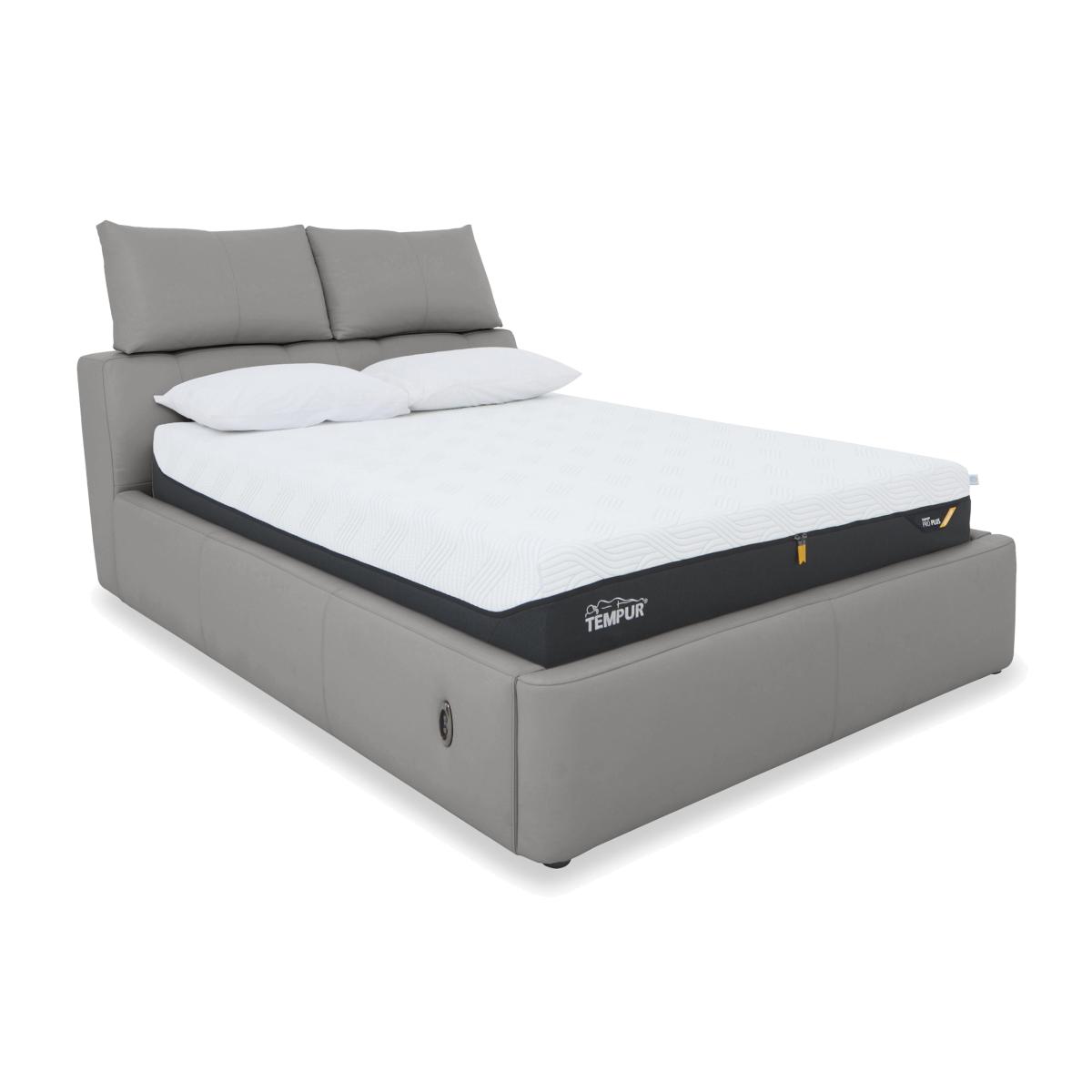 Give your bedroom a contemporary style makeover and treat yourself to spacious extra bedroom storage. Showcasing a fabulous headboard design – double pillow-style headrests that are independently adjustable for perfect-position comfort – the sturdy ottoman bed frames in the Tyrell collection feature maximum-capacity underbed storage spaces. Choose either manual or electric ottoman mechanisms and beautifully tailored upholstery in 100% leather or fabric. The range also includes stylish blanket boxes which double as bedroom seating as well as providing handy extra storage. The Tyrell range is exclusively available at Furniture Village. This luxurious leather electric ottoman bed frame combines fabulous contemporary style – that pillow-style headboard – with perfect-position adjustable headrests. Only at Furniture Village. Upgrade your bedroom style – and your bedroom storage. Contemporary ottoman bed frame has perfect-position comfort built in. Luxurious pillow-style headrest cushions can be moved up and down. Electric-powered ottoman base is effortlessly easy to open and close. Enjoy maximum capacity storage – the underbed compartment is as large as the bed frame. Perfect for lightweight items like duvets, pillows and clothing. Simple touch-button controls with safety locking feature and a USB port. Well-crafted and sturdy. A slatted wood base offers great mattress support. Beautiful 100% leather upholstery in an incredibly wide choice of on-trend colours. In king and super king bed sizes. A Furniture Village exclusive. This leather electric ottoman bed frame is part of our Tyrell range. What you need to know Mattress sold separately. Maximum mattress weight is 80 kg for both king and super king bed frames. Please keep hands clear of the mechanism when opening and closing the ottoman. Do not sit on the foot end of this ottoman bed frame when opening. Leather has unique marks and characteristics with variation in colour and texture. Leather softens with use. Deal with any spills promptly. Professional cleaning advised for oil- and grease-based stains.