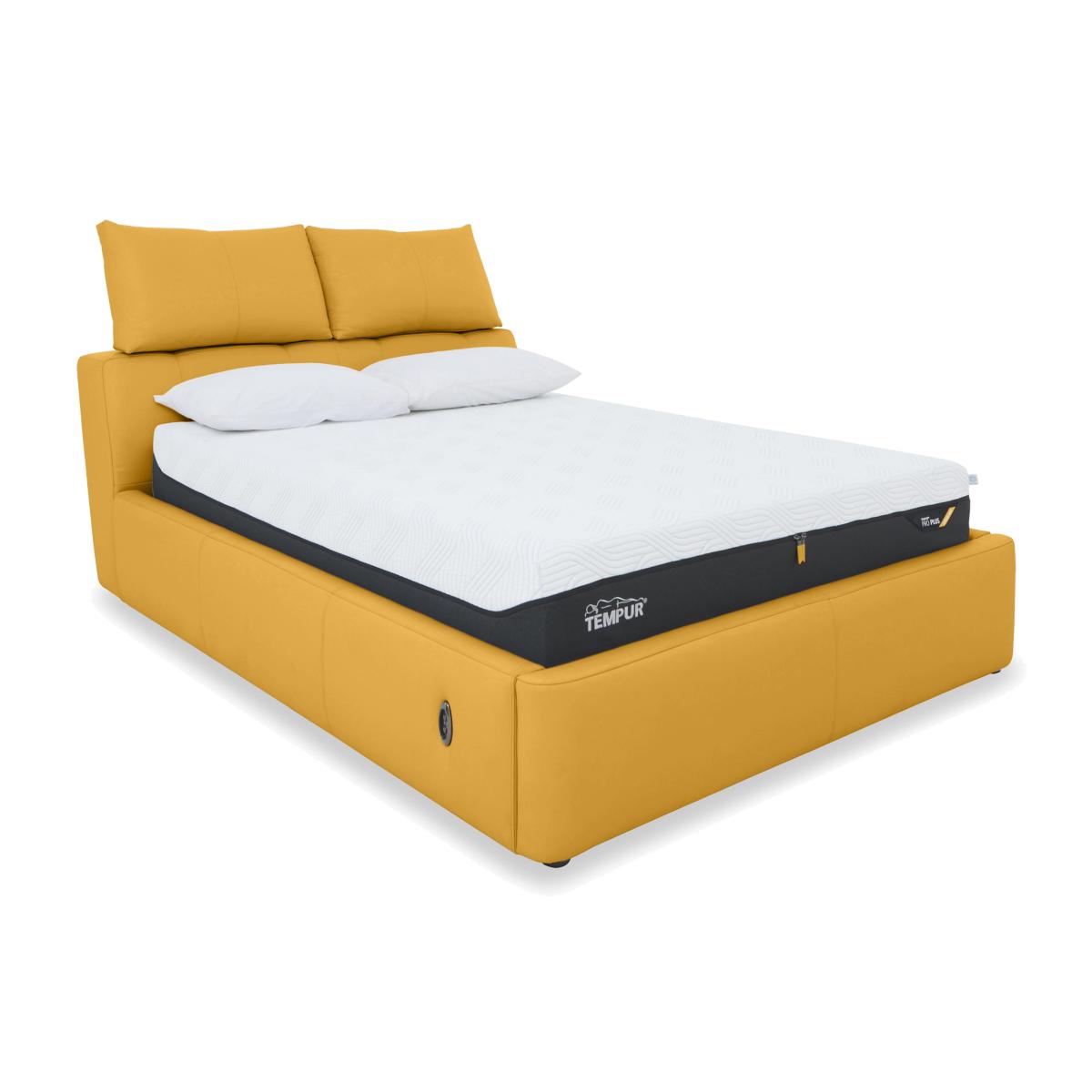 Give your bedroom a contemporary style makeover and treat yourself to spacious extra bedroom storage. Showcasing a fabulous headboard design – double pillow-style headrests that are independently adjustable for perfect-position comfort – the sturdy ottoman bed frames in the Tyrell collection feature maximum-capacity underbed storage spaces. Choose either manual or electric ottoman mechanisms and beautifully tailored upholstery in 100% leather or fabric. The range also includes stylish blanket boxes which double as bedroom seating as well as providing handy extra storage. The Tyrell range is exclusively available at Furniture Village. This luxurious leather electric ottoman bed frame combines fabulous contemporary style – that pillow-style headboard – with perfect-position adjustable headrests. Only at Furniture Village. Upgrade your bedroom style – and your bedroom storage. Contemporary ottoman bed frame has perfect-position comfort built in. Luxurious pillow-style headrest cushions can be moved up and down. Electric-powered ottoman base is effortlessly easy to open and close. Enjoy maximum capacity storage – the underbed compartment is as large as the bed frame. Perfect for lightweight items like duvets, pillows and clothing. Simple touch-button controls with safety locking feature and a USB port. Well-crafted and sturdy. A slatted wood base offers great mattress support. Beautiful 100% leather upholstery in an incredibly wide choice of on-trend colours. In king and super king bed sizes. A Furniture Village exclusive. This leather electric ottoman bed frame is part of our Tyrell range. What you need to know Mattress sold separately. Maximum mattress weight is 80 kg for both king and super king bed frames. Please keep hands clear of the mechanism when opening and closing the ottoman. Do not sit on the foot end of this ottoman bed frame when opening. Leather has unique marks and characteristics with variation in colour and texture. Leather softens with use. Deal with any spills promptly. Professional cleaning advised for oil- and grease-based stains.