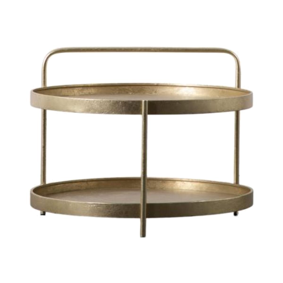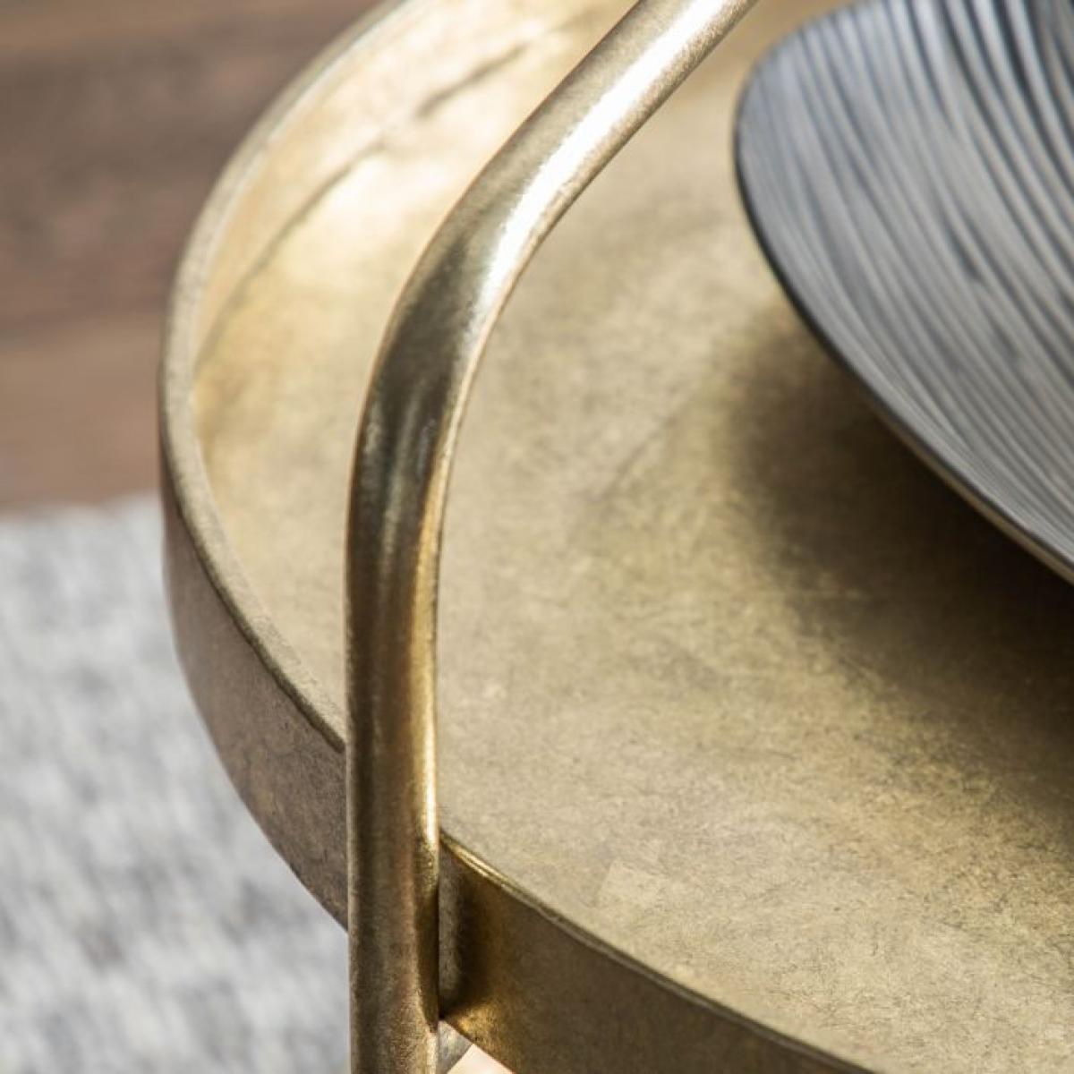 Contemporary coffee table is crafted from metal with a gold leaf finish, with a tray-style top and lower shelf. The stunning design features a continuation of one section of the base, up and over the table to create a ‘handle’ effect.