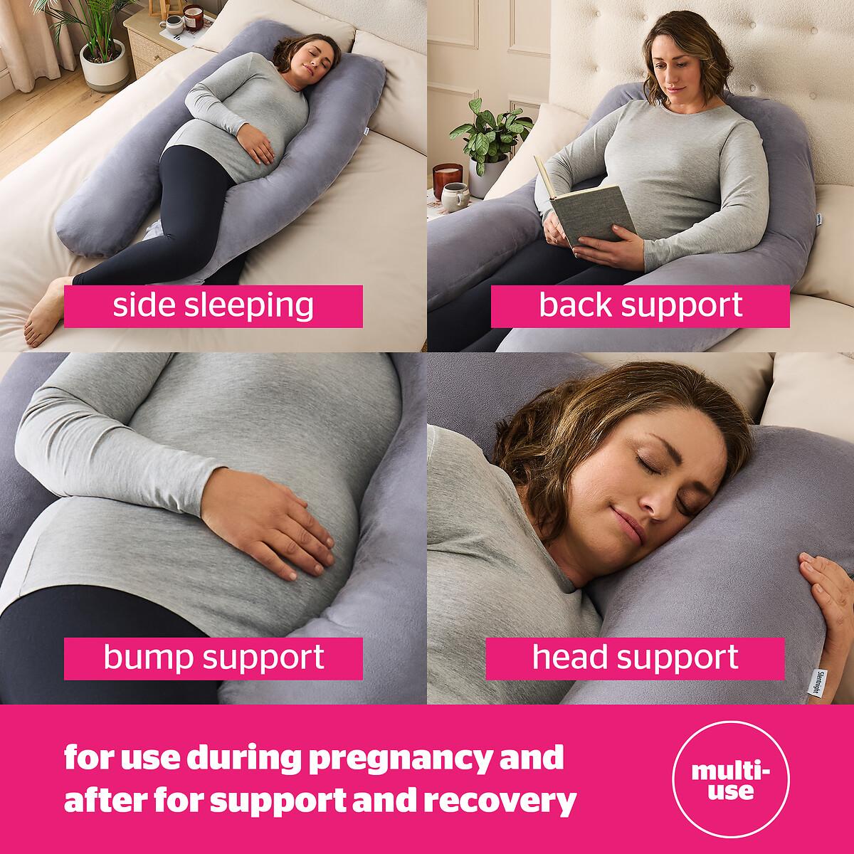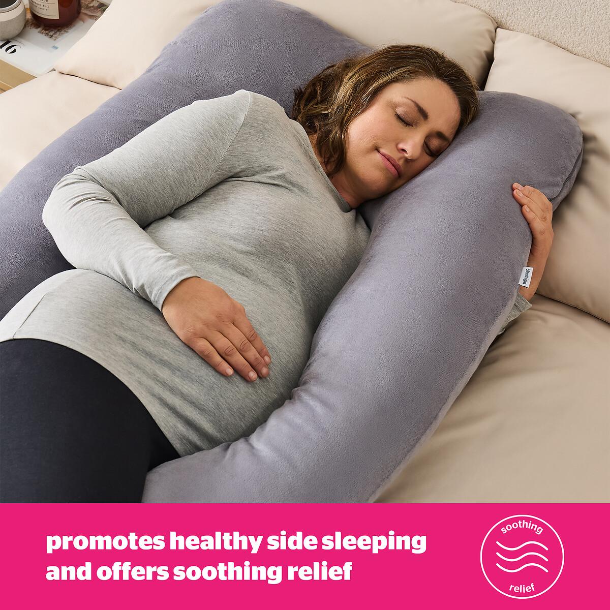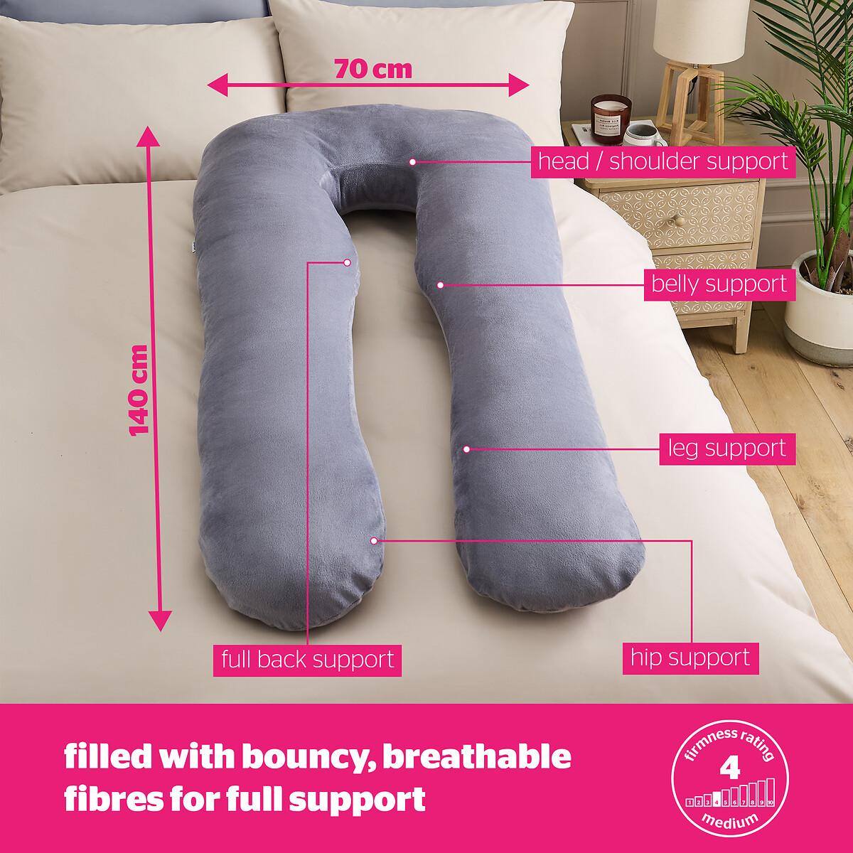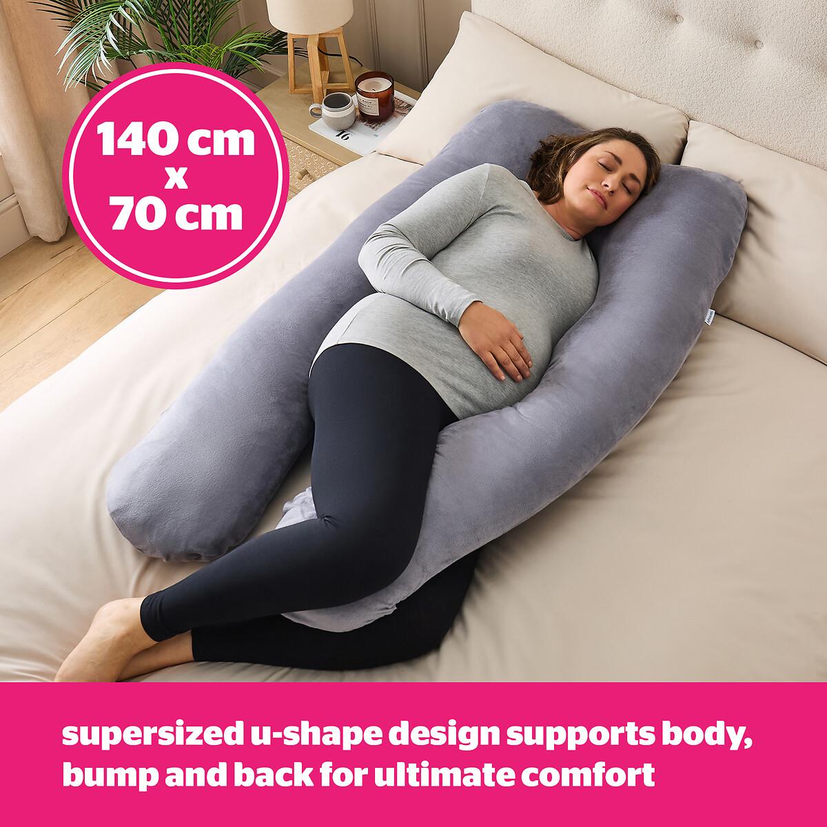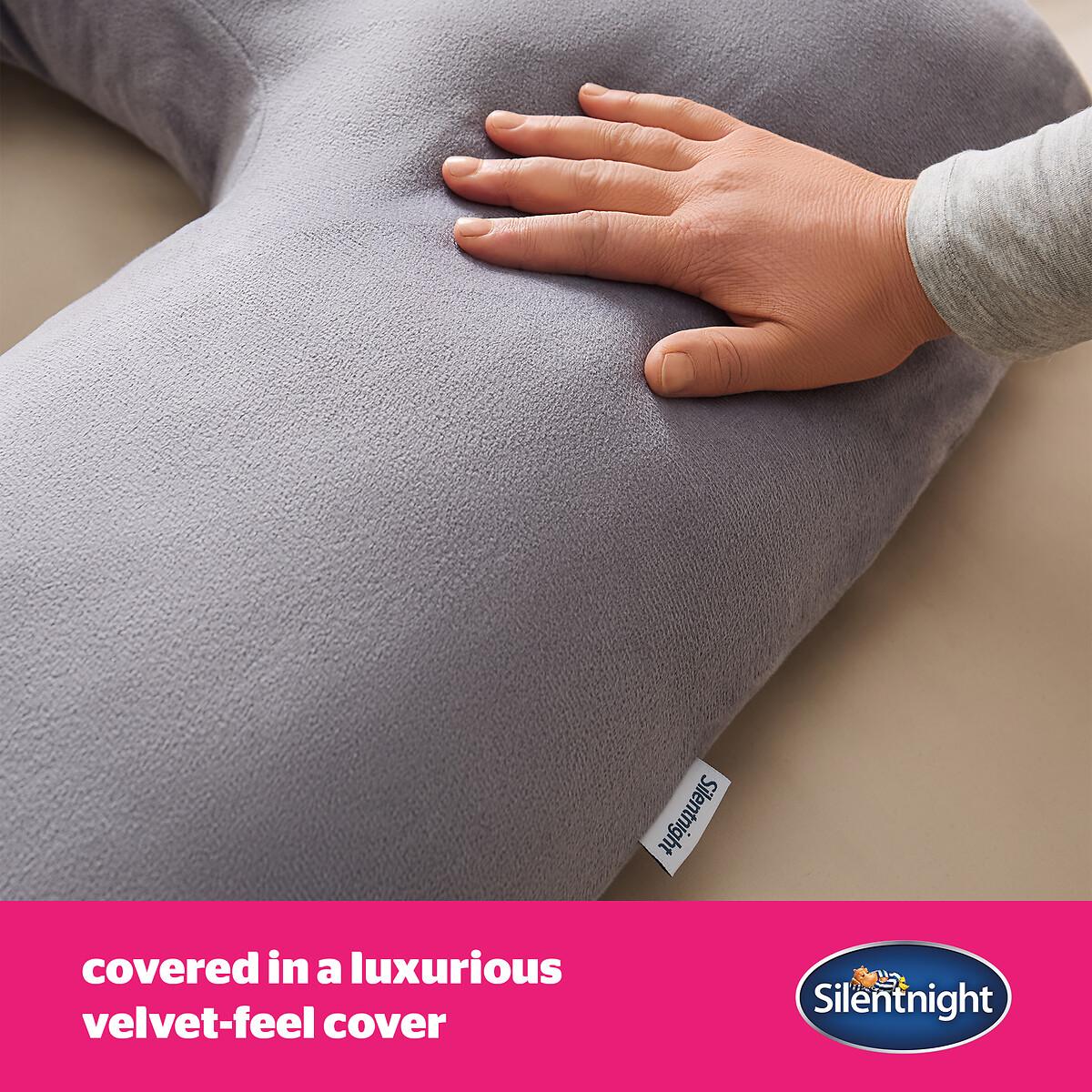 For full body comfort and support when sleeping or relaxing, the Silentnight Body Support U-Shaped Pregnancy Pillow fits the natural contours of the body, supporting bump & back, for the most comfortable night’s sleep. Uniquely designed with support and comfort in mind, the supersized ergonomic design promotes healthy side sleeping and provides relief from back, neck, hip, and knee discomfort you may get during and after pregnancy. The pillow is covered in a luxurious velvet-feel cover and filled with wonderfully squishy hollowfibre, for ultimate comfort. Silentnight are the UK’s most trusted bed brand with over 75 years’ experience in creating products that offer solutions for every sleeper. Key Features:• ERGONOMIC FULL BODY SUPPORT:Uniquely designed with support and comfort in mind, the ergonomic supersized u-shape, measuring 140x170cm, fits the natural contours of the body, supporting bump & back, for the most comfortable night’s sleep.• ENCOURAGES HEALTHY SLEEP:Promotes healthy side-sleeping to help you have a more comfortable and relaxing night’s sleep throughout your pregnancy. • SOOTHING RELIEF FOR PREGNANCY & BEYOND: All over body support and relief from the back, neck, hip, and knee pain you might feel during and after pregnancy.• MULTI USE: For sleeping or relaxing, the u-shape will encase your body in soft and plush comfort whether you are relaxing on the bed, on the sofa or whilst nursing. For use during and after pregnancy for support and recovery. • BREATHABLE COMFORT: Filled with wonderfully bouncy, breathable fibres and covered in a luxurious velvet-feel cover for ultimate cosy feels and comfort. • WASHABLE:Machine washable cover so you can keep your pillow feeling fresh. Product Dimensions:140x 70x 16 cmON E SIZEThis product will be dispatched by one of our trusted suppliers. You’ll be contacted by their selected courier about your delivery.