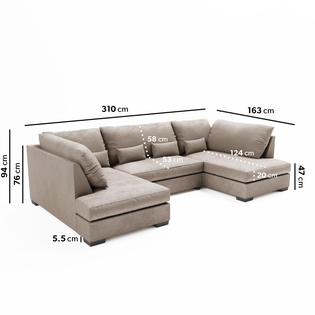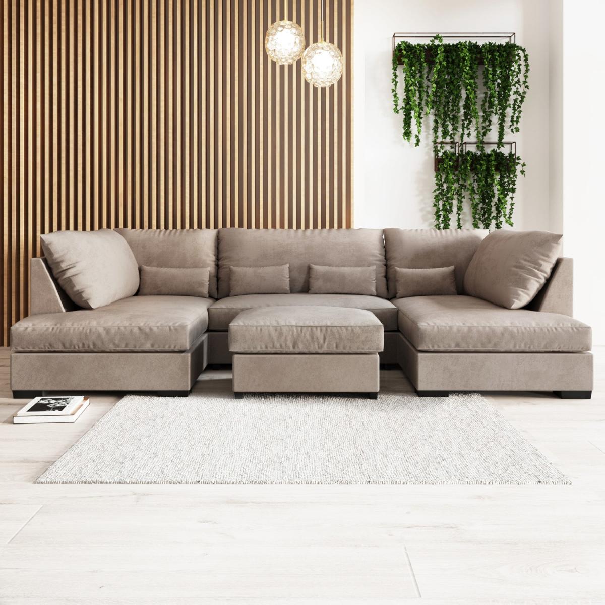 Create your perfect utopia with the Madison U shaped sofa. Comfortably seat the whole family for movie nights and never run out of space for extra guests. The beige woven fabric and soft plush cushions offer just the right amount of support to help you relax. Still need more seating? The matching footstool adds that finishing touch to the set, as well as creates an additional seat.