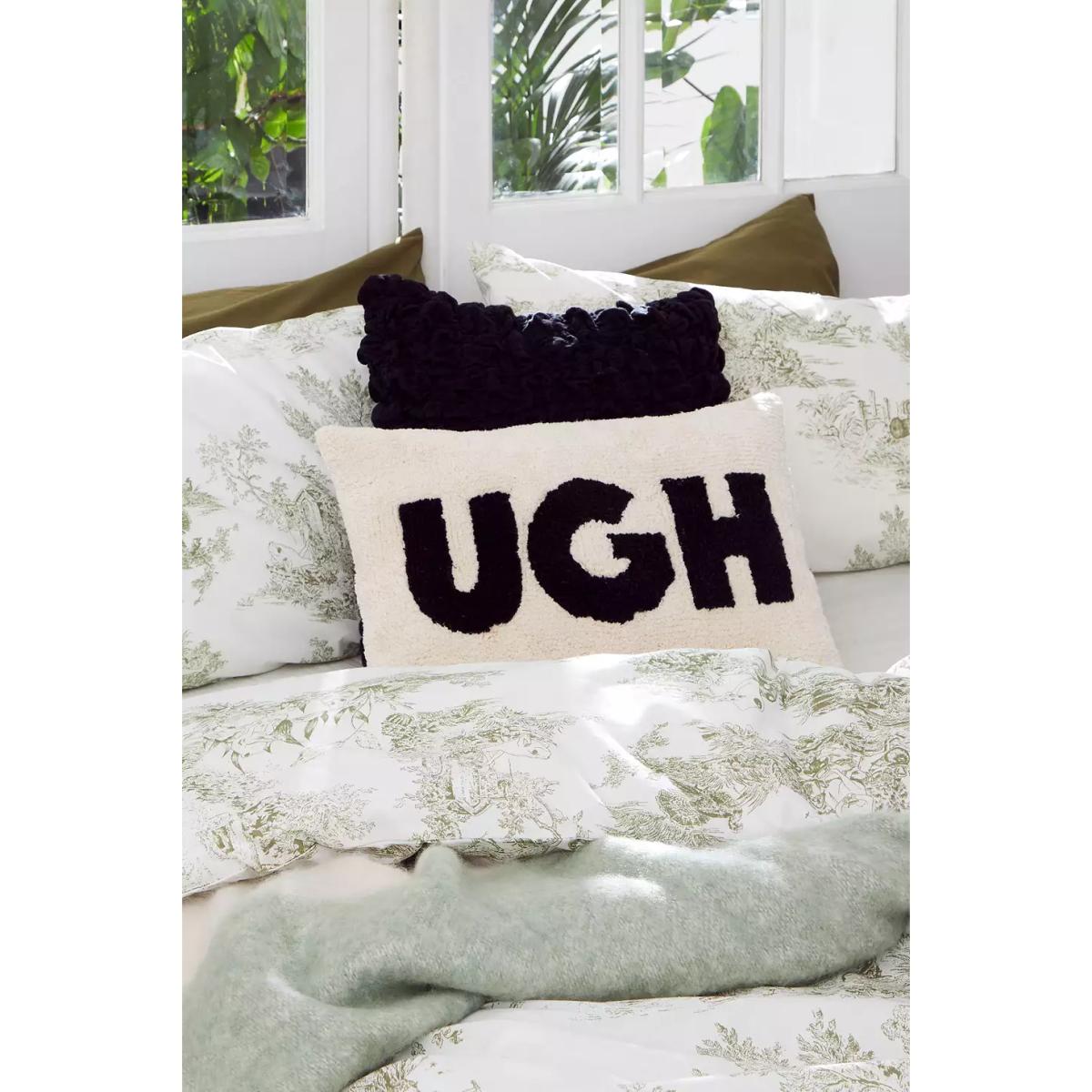 Tell everyone how you're feeling with this 'UGH' cushion. Rectangular cushion Ft. a tufted finish with a monochrome slogan motif at its centre. **Content + Care** \- Main: 100% Cushion \- Fill: 100% Polyester \- Spot clean