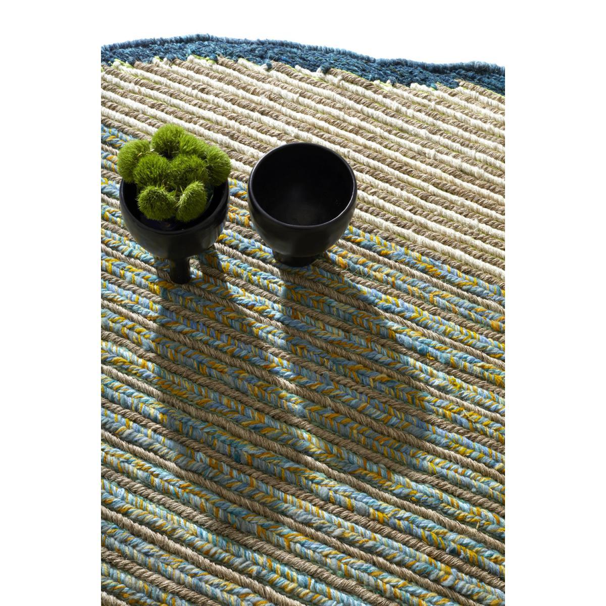 The diversity of Colombia’s landscapes inspired the young Dutch designer Mae Engelgeer for her Uilas rug. The Colombian province of Huila exists on the meeting of two forces of nature: the Rio Magdalena river and the Tatacoa desert. The designer brings the contrasting play of these natural phenomena to life in this rug with its asymmetrical contours, where natural hues are punctuated with subtle touches of vivid colour. The soft colours of the land and the desert meet the blue and green of the Rio Magdalena and its multifaceted floodplains. With its fique fibre, the colours and forms of the desert take shape. 100% natural, this vegetable fibre of Colombian origin comes from the tree of the same name. This sturdy fibre is used in the traditional manufacture of coffee sacks found throughout Colombia. Fique fibre is combined with virgin wool, soft and natural, which symbolises the luxuriance of the river valley. The twisted threads of the two natural materials form colourful stripes and produce an unusual spectrum of colours and brilliance. Uilas rugs are handcrafted in small traditional factories in the Colombian provinces of Santander and Boyacá. The incredible manual dexterity of knotters and weavers is evident in the asymmetrical shapes that give Uilas rugs a fun look.
