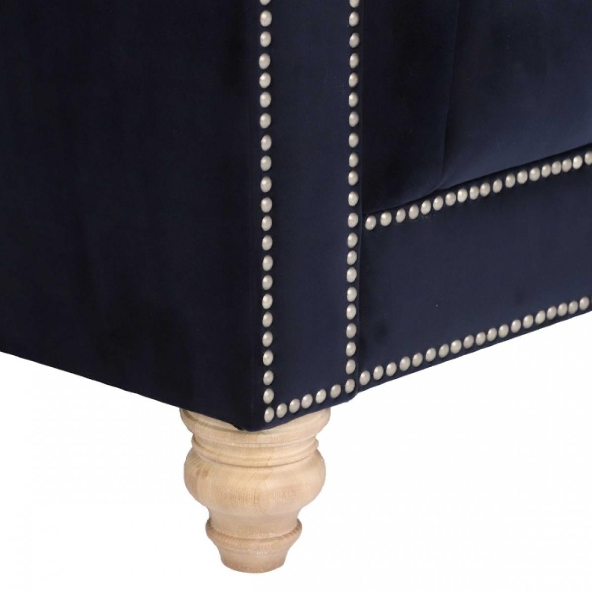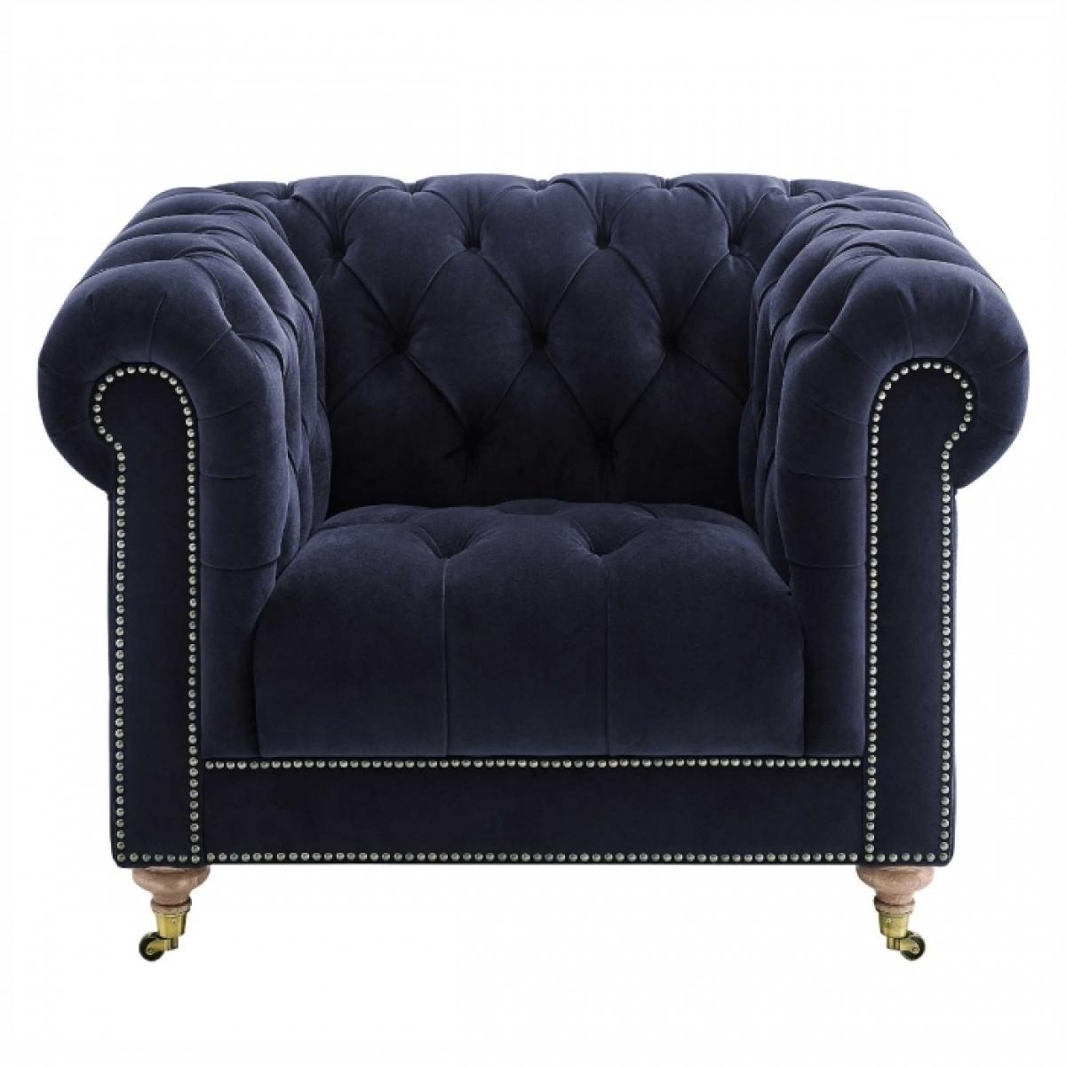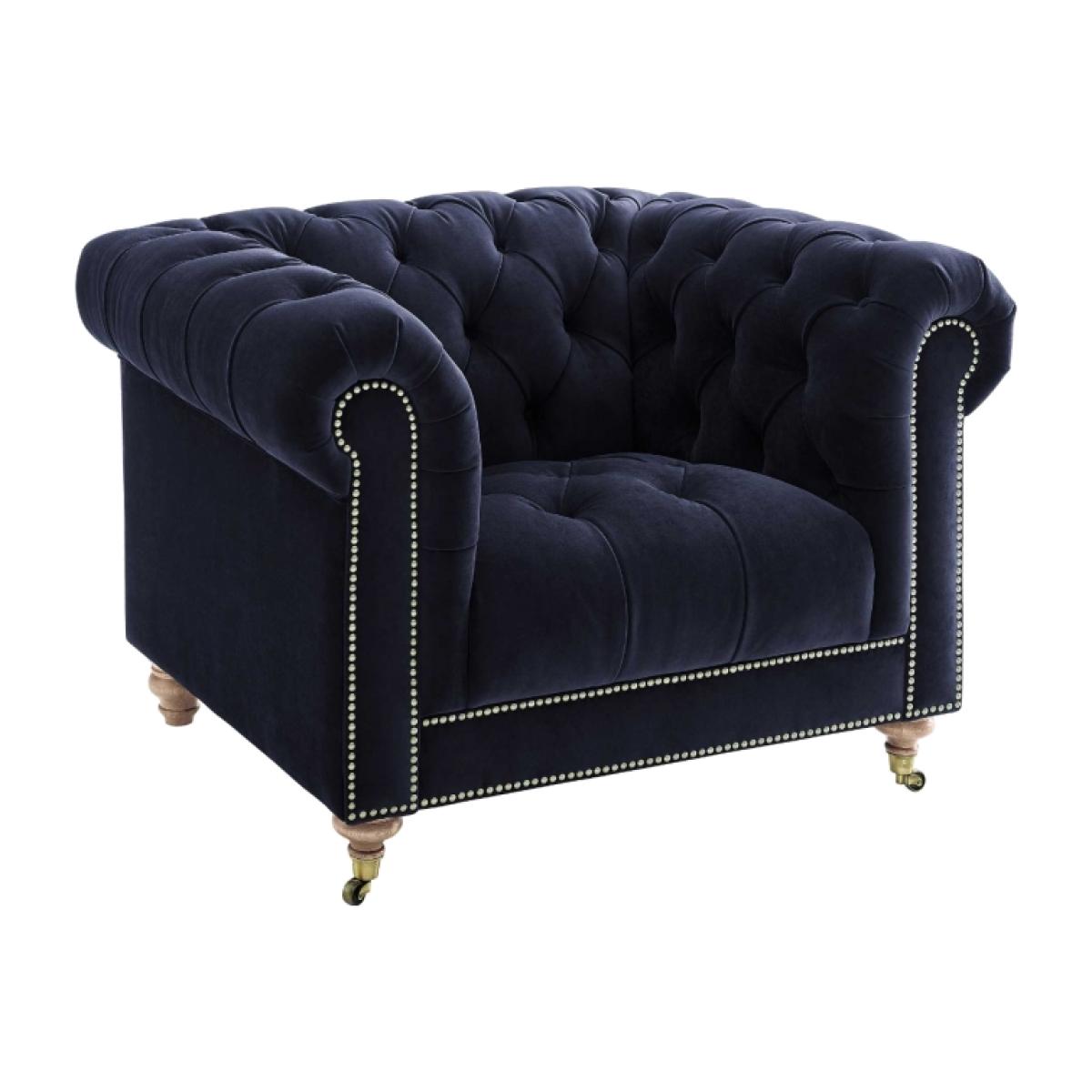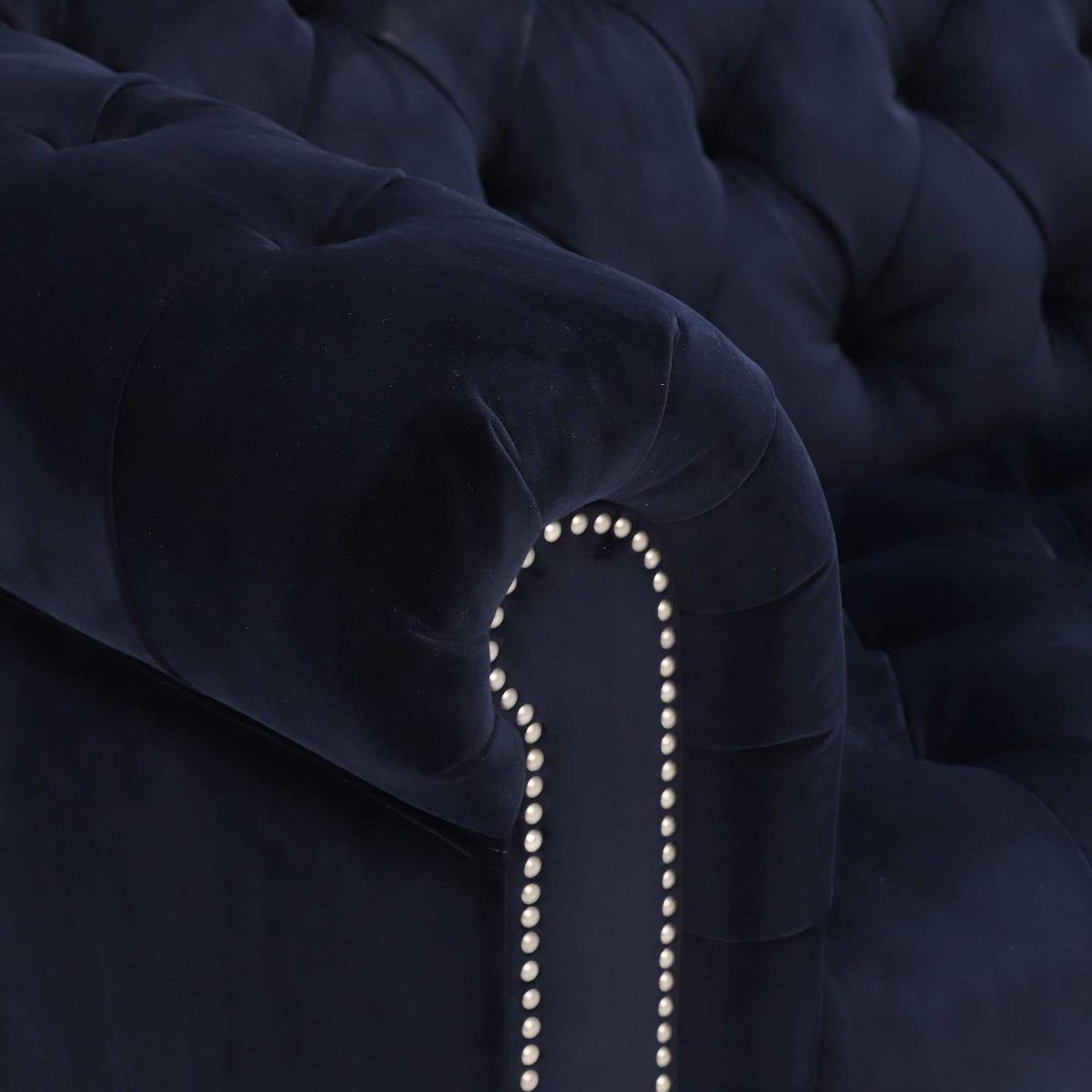 I’d describe this as a modern take on the classic club chair - its deep-buttoned navy velvet and brass stud detailing add a refined edge without feeling fussy. It sits beautifully in both contemporary and traditional schemes, from a pared-back Scandi living room (pair with oak accents and a light jute rug) to a more dramatic Art Deco-inspired corner alongside marble or brass-edged tables. For styling, keep nearby soft throws or a geometric cushion to break up the dark upholstery, and angle it slightly rather than pushing flush against the wall to make the space feel more inviting. Velvet will show marks over time, so give it a quick brush now and then and avoid direct sunlight to help keep the pile looking even.
