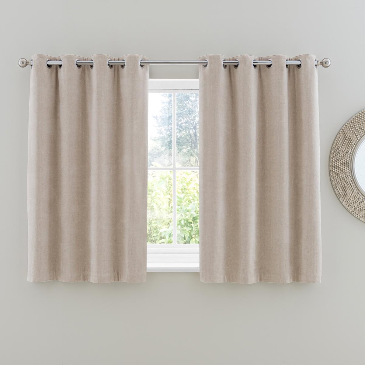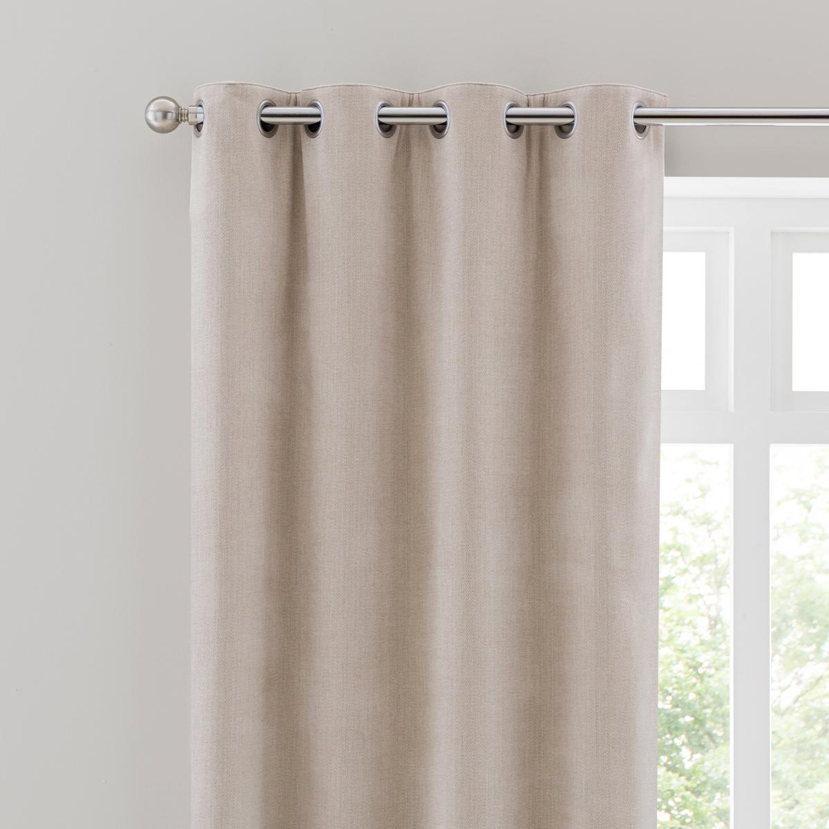 Add a stylish touch to your room with these curtains that have been crafted from a luxuriously soft chenille fabric in a natural tone. This pair of ultra blackout curtains has been designed with a laminated blackout lining and a discreet blackout-lined panel which folds down behind your curtain pole to prevent light coming through the eyelets. Perfectly suited to both contemporary and traditional styles, these chenille curtains crafted from recycled polyester, improve insulation by blocking out heat in summer and maintaining warmth in winter whilst ensuring maximum light block and privacy. Finished with a modern brushed steel eyelet header for easy installation and smooth movement across your curtain pole, Chenille Blackout Ultra curtains are available in a selection of sizes to suit your requirements. Pair with coordinating cushions to complete the look. Please note:. Pattern matching can not be guaranteed across multiple pairs of curtains. This collection is verified by OEKO-TEX® and independently tested for harmful substances as well as manufactured using sustainable processes under socially responsible working conditions.