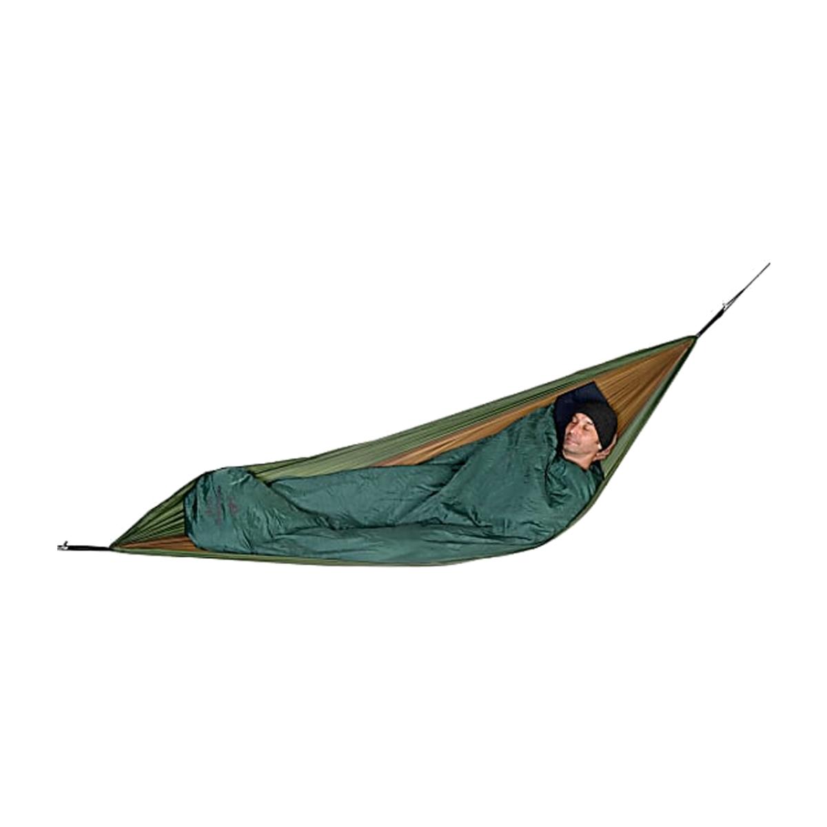 Topquilt is the ideal solution for comfortable nights in your hammock. When you are curled up in your Ultra Light hammock, the hollow fibre filling gives you perfect thermal insulation from above. The conical form of Topquilt is specially designed for spending the night in your hammock without any irritating zips. That way you can get in and out of the hammock without a problem, and you have complete freedom of movement for maximum comfort when you are asleep. The top is individually adjustable. The closed lower end gives you particularly effective thermal insulation from the knee down.