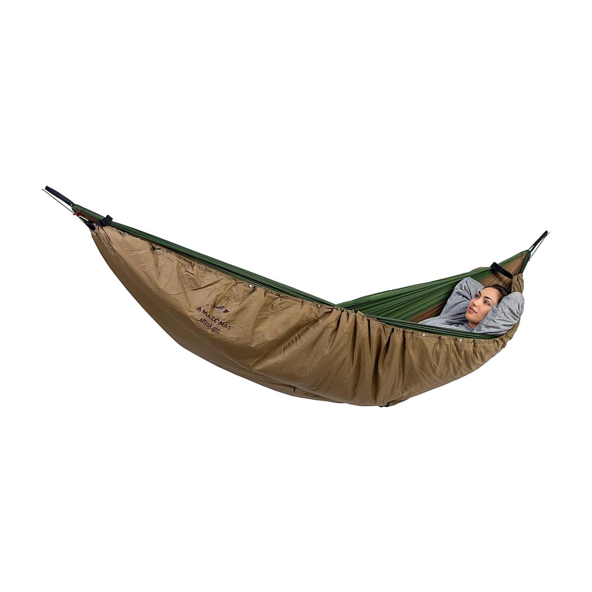The Underquilt Poncho provides you and your ultra-light hammock with the perfect insulation from below thanks to the microfibre filling. Simply suspend beneath the hammock, and done! The Underquilt poncho can be transformed into a warming poncho in an instant thanks to its built-in zip fastener: Open the zip fastener, pull the Underquilt poncho over your head, button up, done. On the front side there is a small storage pocket for your smartphone etc. including continuously adjustable, removable suspension ropes and straps for attaching directly beneath the hammock (hammock/sleeping bag not included).