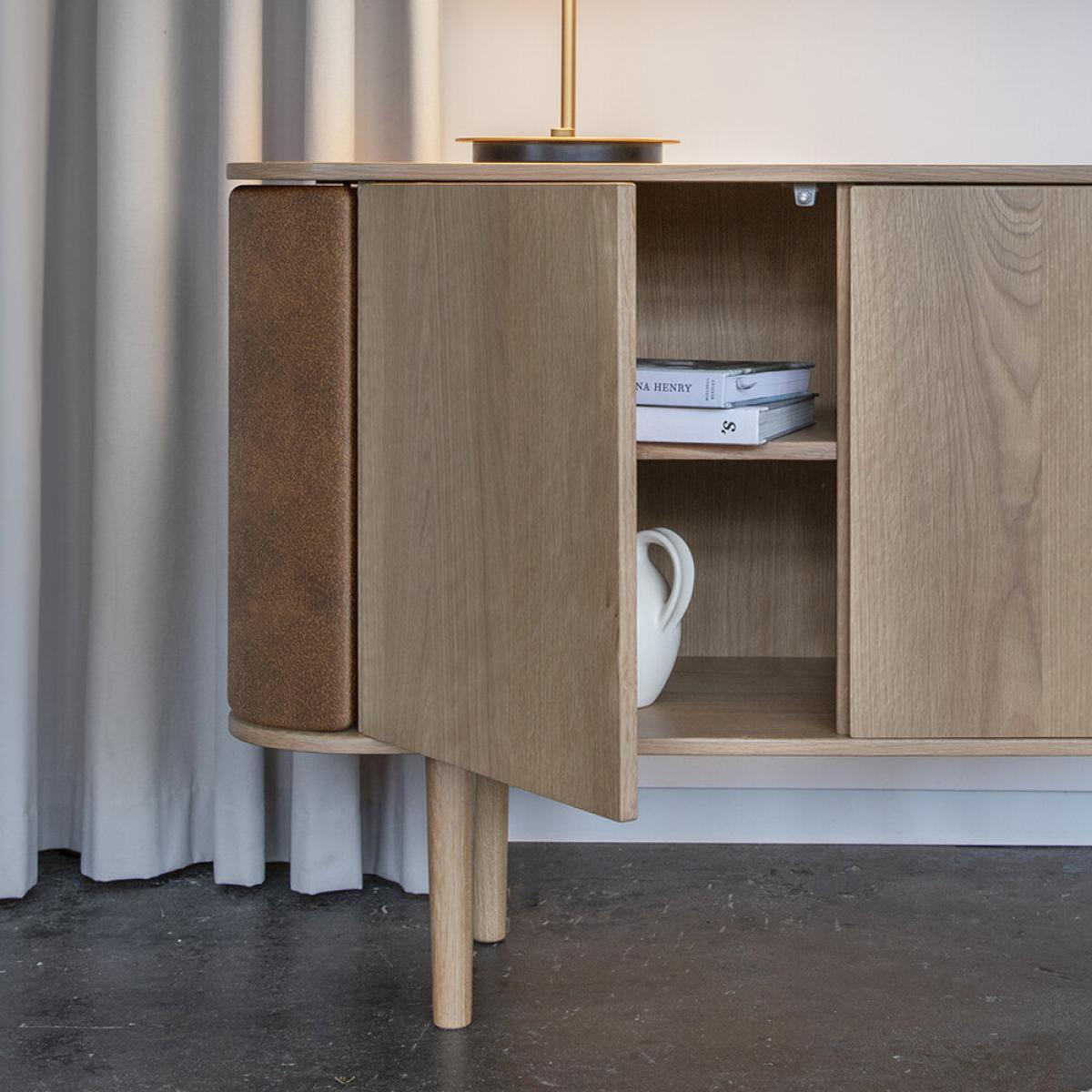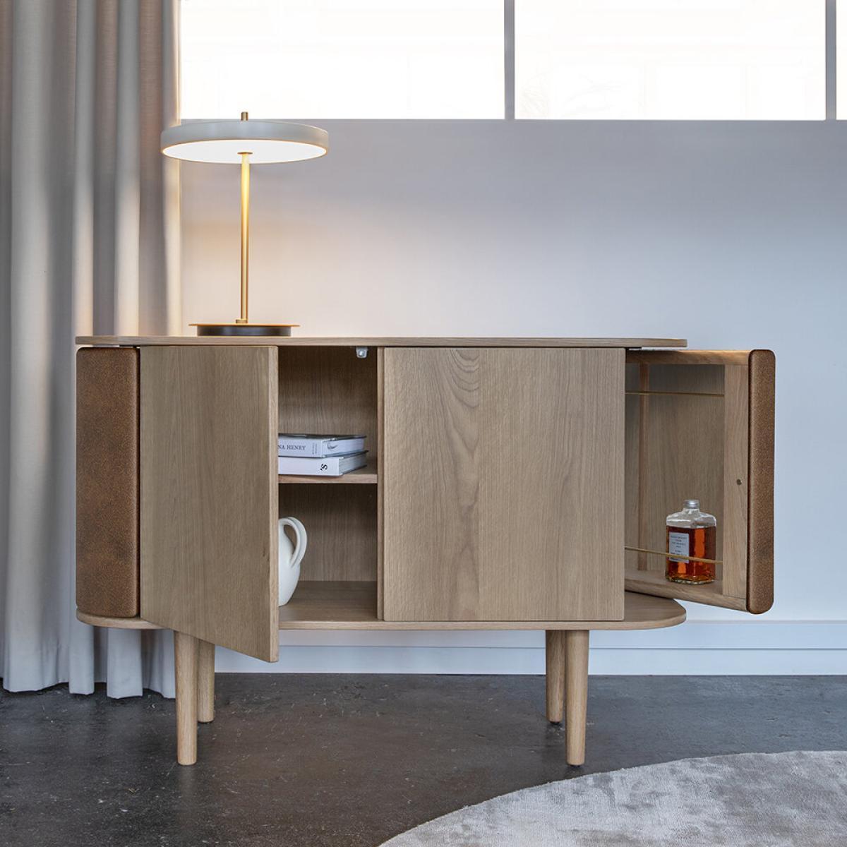 Get smart when it comes to storage with this Treasure cabinet from UMAGE. Made from veneered oak wood and finished with curved sides, this tactile two door cabinet will elegantly hold your favourite things. With a shelf inside each compartment and side doors that open in a ‘wing’ motion, it’s the ideal way to store books, ceramics, DVDs and any other treasures. Self-assembly is required.