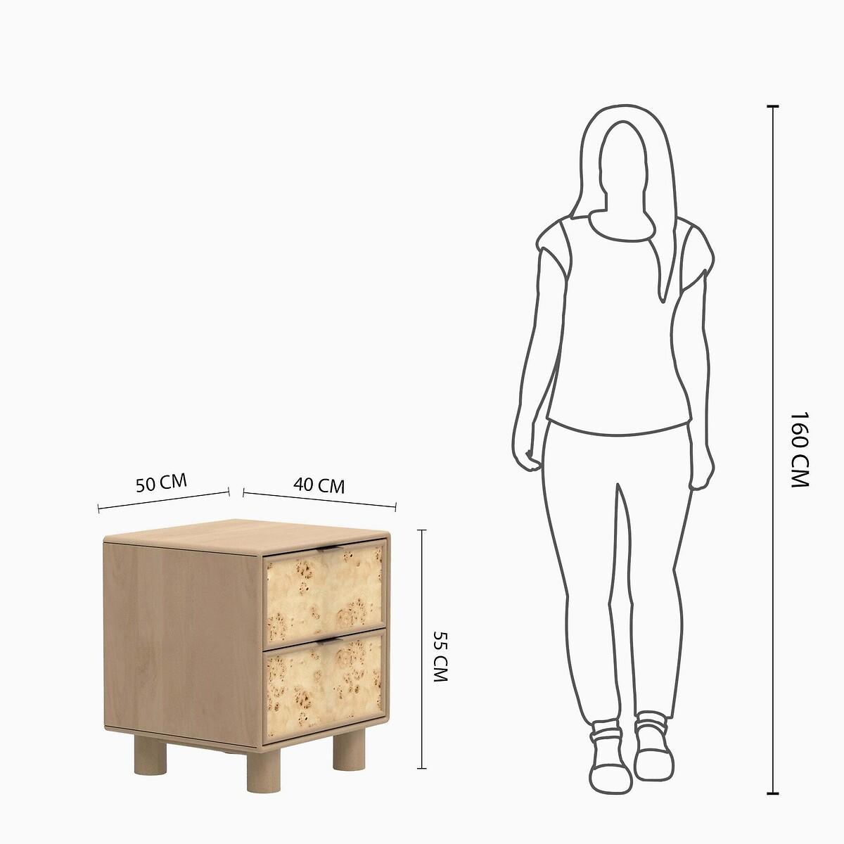 The Metro Burl Side Table is a mango wood masterpiece featuring a striking burl veneer. Unique knots add depth and character, while practical drawers and sleek legs offer both functionality and contemporary elegance. Part of the Metro Burl Collection, it’s ideal for lovers of clean lines and the minimalist Japandi aesthetic. Product details• Mango Wood• Number of drawers:2• Full assembly required. Product Composition - Mango Wood,Mdf,Veneer. Product Dimensions - 50 cm x 40 cm x 55 cm , Weight - 15.38 KG• Height of table: 55cm• Length of table:50cm• Clearance to floor: 10cm. Package Dimensions - 59 cm x 59 cm x 54 cm, Weight 19.8 kg. This product will be dispatched by one of our trusted suppliers. You’ll be contacted by their selected courier about your delivery.