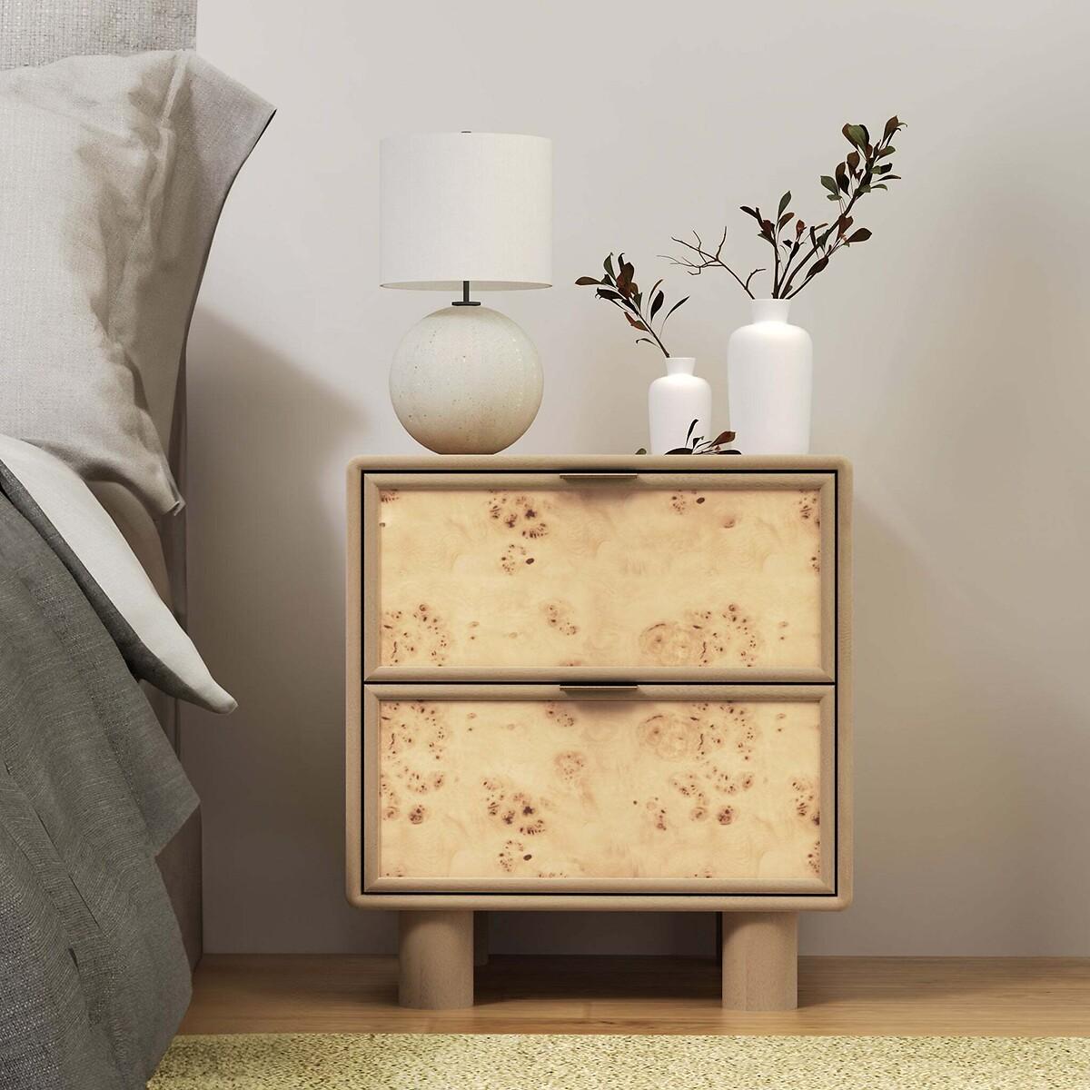 I love the earthy feel of this bedside table; the combo of umber burl and mango wood gives it a warm, natural vibe that works well in both mid-century modern and eclectic interiors. It’s a versatile piece that adds texture and warmth without overwhelming the space. For styling, consider pairing it with simple ceramic lamps, minimal greenery, or sleek books to keep the look modern and uncluttered. Its neutral tones and clean lines also make it great for layering with other wooden or textured furnishings, helping to create a cosy yet polished bedroom atmosphere.