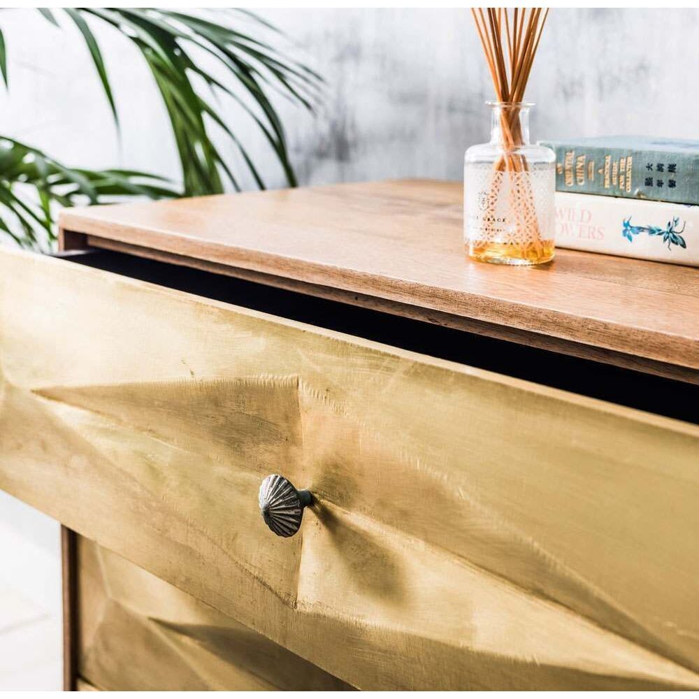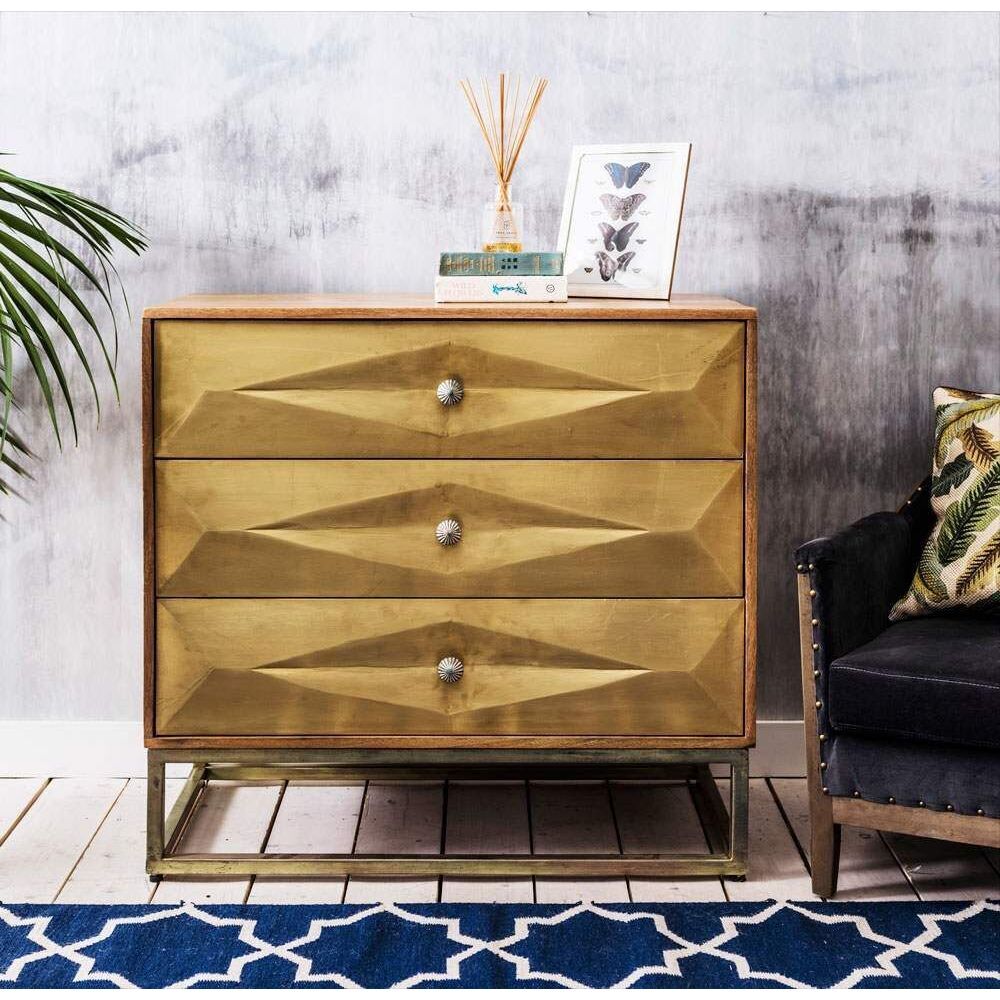 Give your bedroom the Midas touch with our impressive Umberto Brass Chest Of Drawers. Providing plenty of storage and emulating the very best of art deco design. This unique piece features a set of three stunning wood drawers wrapped in smooth, high quality brass sat atop distinctive brass-plated legs and finished with a beautifully detailed handle. H90 x W95 x D50cm. Constructed mango wood, MDF and brass with lacquered brass-plated iron legs and handles. Features three drawers. Please note, these drawers do not sit on runners. If some slight sticking does occur, we recommend rubbing a bar of soap along the edges to make the pull more smooth. To avoid watermarks and heat damage, do not place items such as ceramics, tableware or glassware directly onto the surface of any of our furniture without the protection of a heat resistant mat, coaster and/or trivet as this could mark the surface.