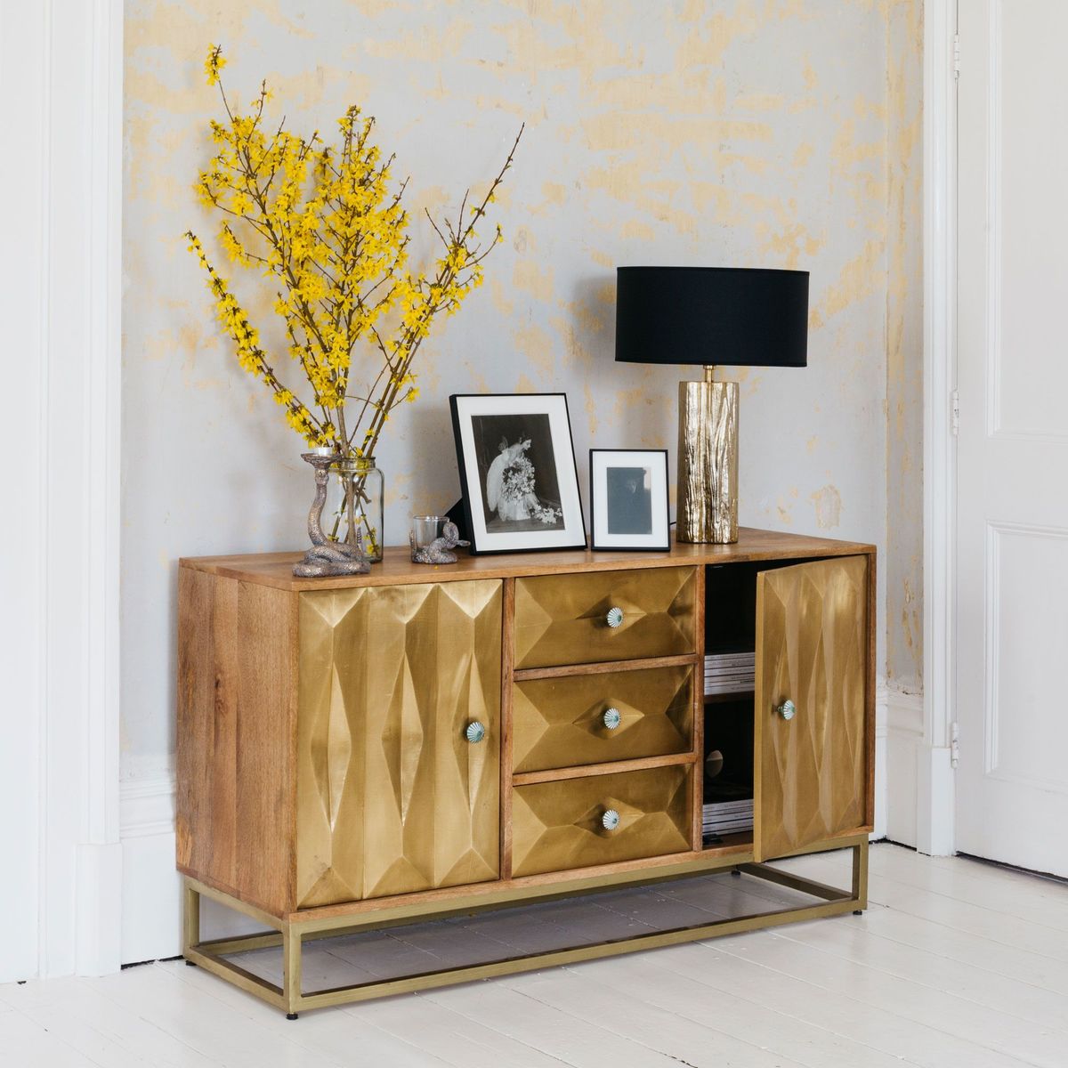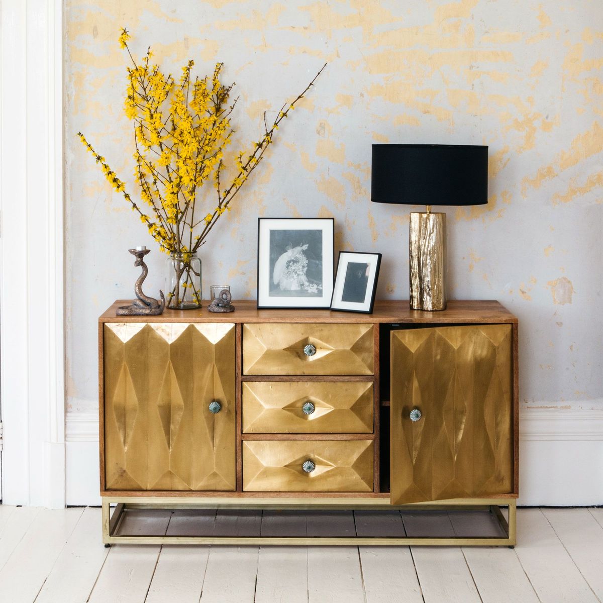 Art deco inspired, our Umberto brass sideboard is a distinctive piece promising timeless style. Made from mango wood, the brass finish gives it a luxurious quality complemented by the iron framework. Ample storage space is concealed behind three drawers and two large cupboard doors, ideal for stowing away everyday household items. Psst,. To download our handy guide to check if your new furniture will fit correctly into your space before you order.