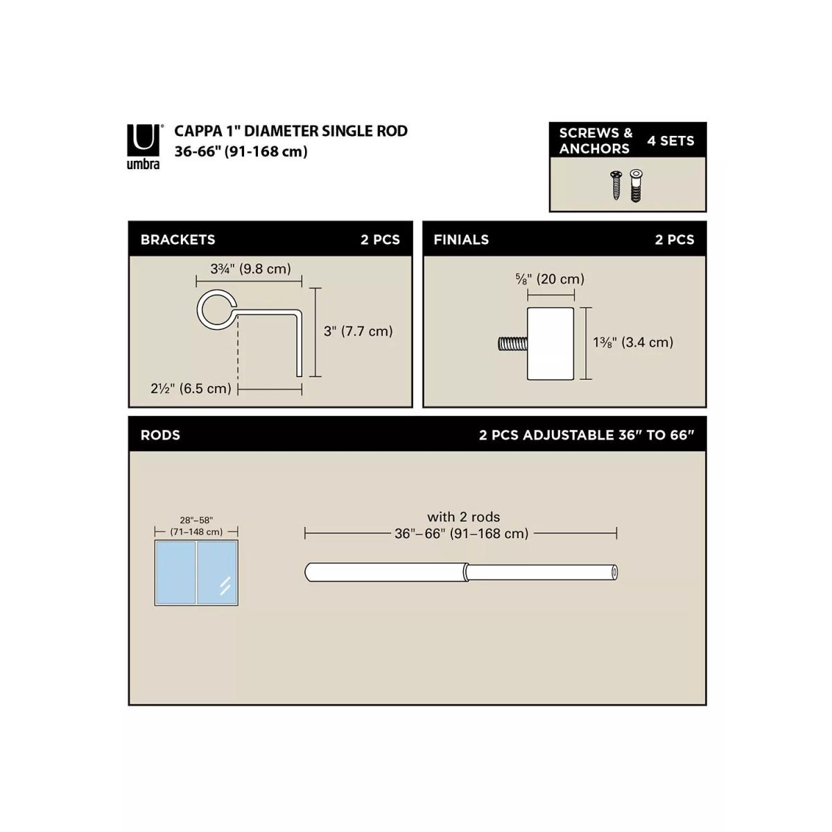 With an attractive, modern and understated look the Cappa extendable curtain pole from Umbra is designed to complement your curtains without drawing attention away from them. The universal design makes it suitable for any room. Features include: Telescopic design so you can extend it to fit your space. This also means you can have a consistent look at all your windows throughout your home, no matter what size they are Made of steel it can hold a maximum weight of 10kg so so light to medium-weight curtains are supported Easy to install the kit comes with the rod, finials, brackets, metal screws, plastic screw anchors and all the assembly instructions you need