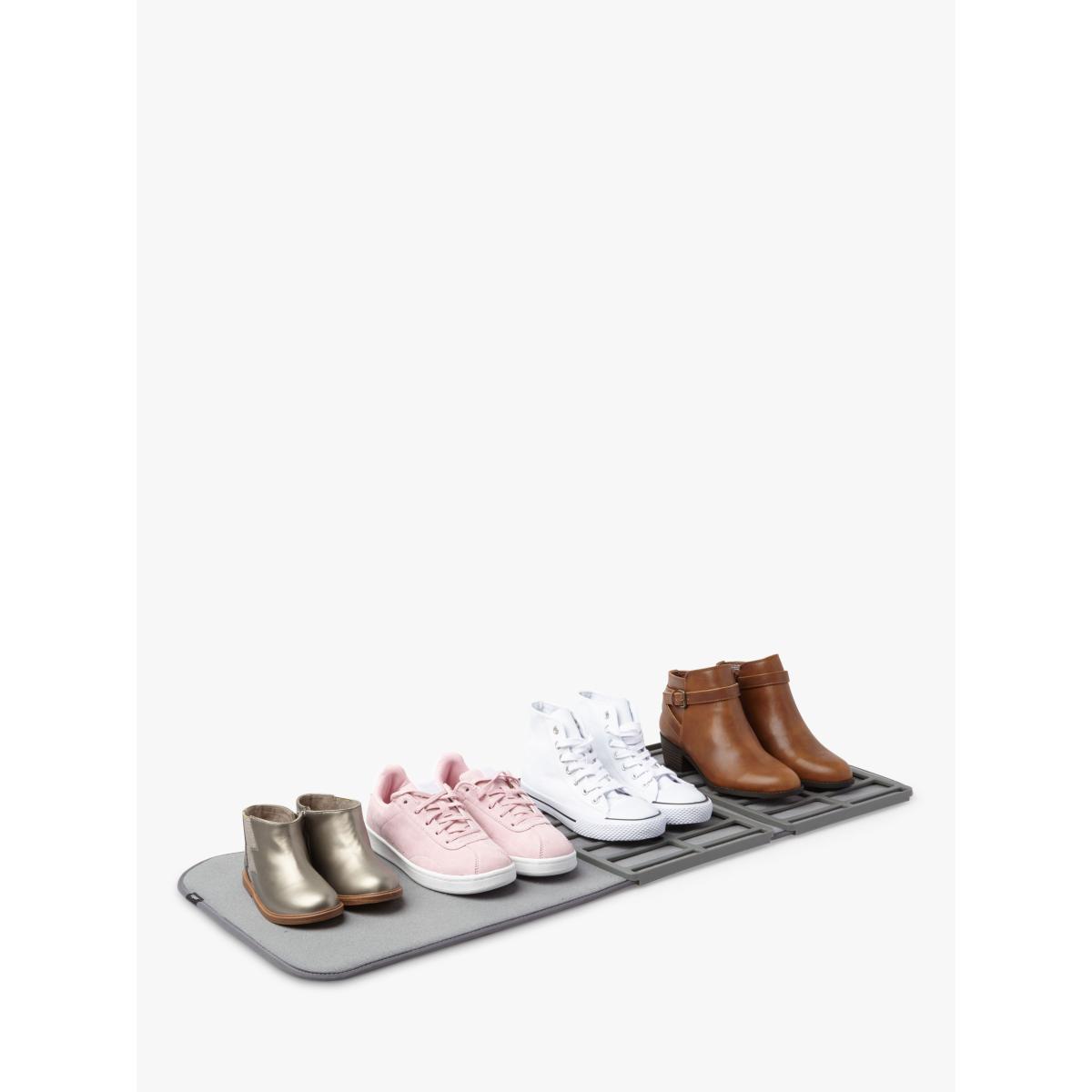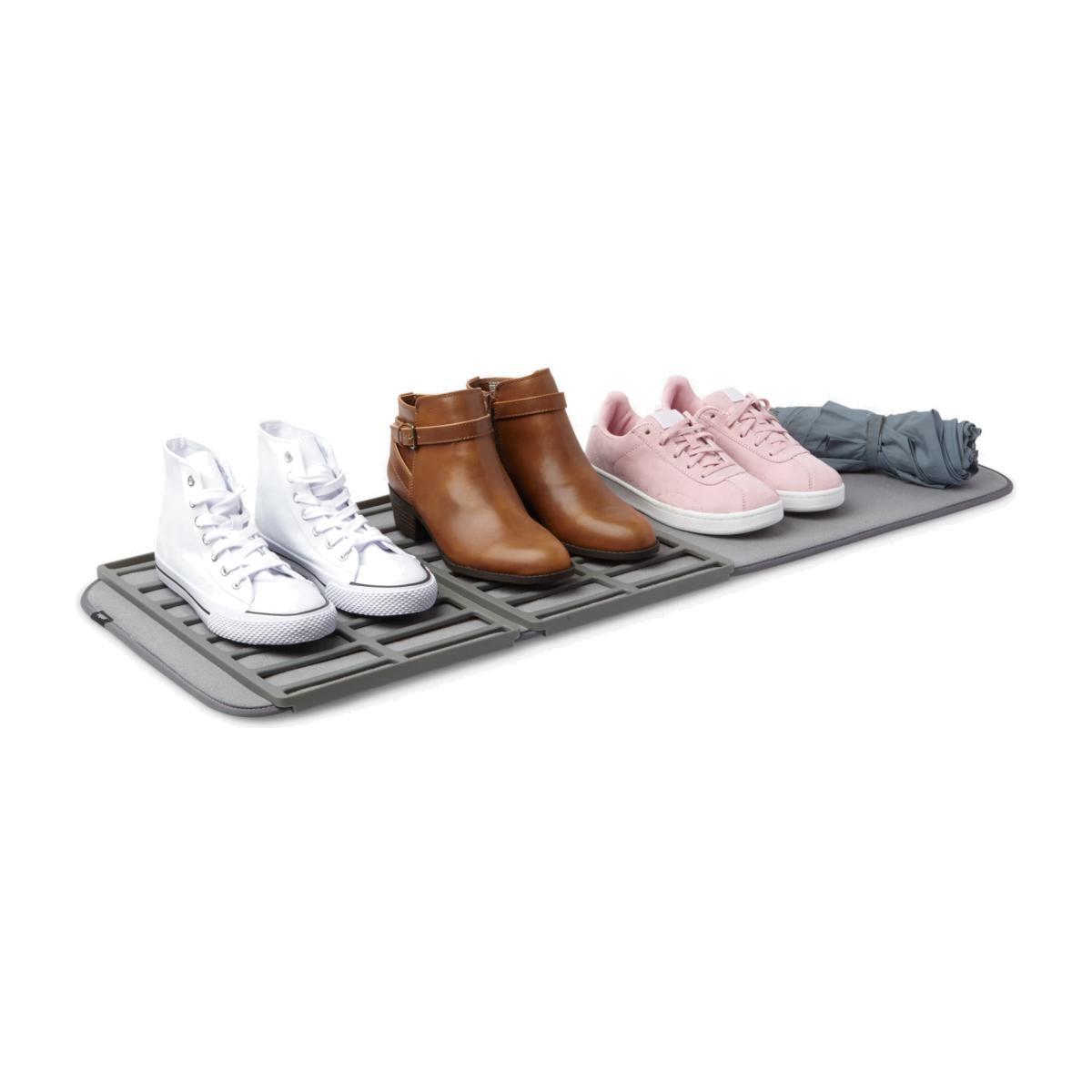 A 2-in-1 quick dry microfibre mat with a moulded shoe rack. The rack can be secured to the middle or the side of the mat, leaving space for dry shoes as well as wet. It can also be removed for easy cleaning.