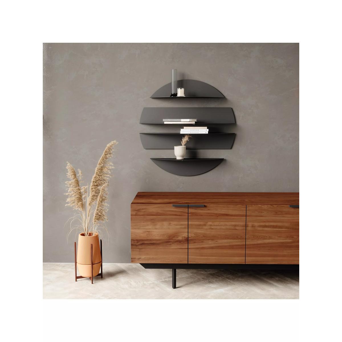 I love this wall shelf for its sleek, modern look and versatile design. Its geometric, layered style makes it a statement piece perfect for contemporary interiors, whether in a minimal, Scandinavian, or even an industrial space. Because of its neutral colour palette and clean lines, it works well in a variety of colour schemes and rooms, from living areas to bedrooms or even home offices. Practical styling tips include using the top tier for decorative objects like vases or sculptures, while the middle shelves are ideal for organised books or plants, and the bottom can hold larger accents or keepsakes. Its size makes it functional without overwhelming the wall, offering a stylish way to display and store essentials with a touch of mid-century modern flair.