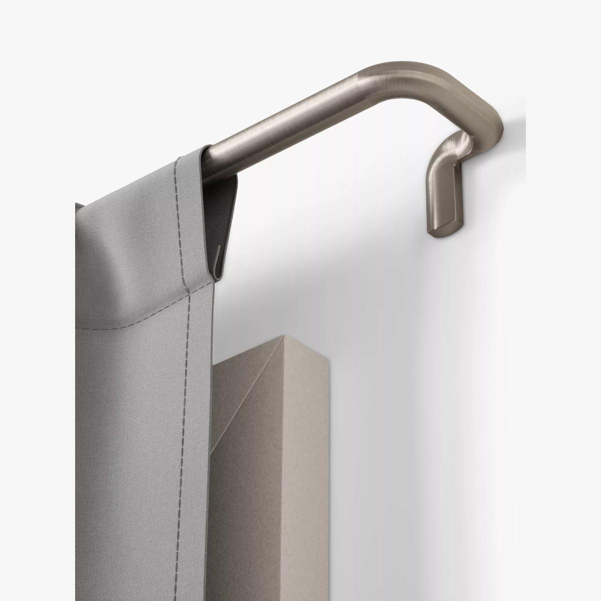 With a simple, clean design the Twilight room darkening curtain extendable pole beautifully complements and enhances any curtains or drapes. Its sleek form and matte finish can be easily integrated into a variety of different decors and while it blocks out the light it also insulates the room. The Twilight curtain pole effectively blocks out all light. Its innovative wrap-around design helps prevent light leakage by allowing your curtain or drapery panel to rest directly against the wall. Wrap the panel around the curved end of the pole and tuck it behind the bracket to eliminate exterior light from seeping in. The curtain pole has a strong and stable diameter, constructed to hold curtains from light to medium weights, with a maximum capacity of 22lbs (10 kg). This adjustable curtain pole works with a variety of decor styles and can be used with grommet, back-tab, rod pocket and tab-top curtains. Single pole brackets sit 3 3/4” (9.5 cm) from the wall. Double pole brackets sit 5 1/4” (13 cm) from the wall. The Twilight Curtain Pole comes with everything you need to get set up quickly and doesn’t require a curtain pole bracket.