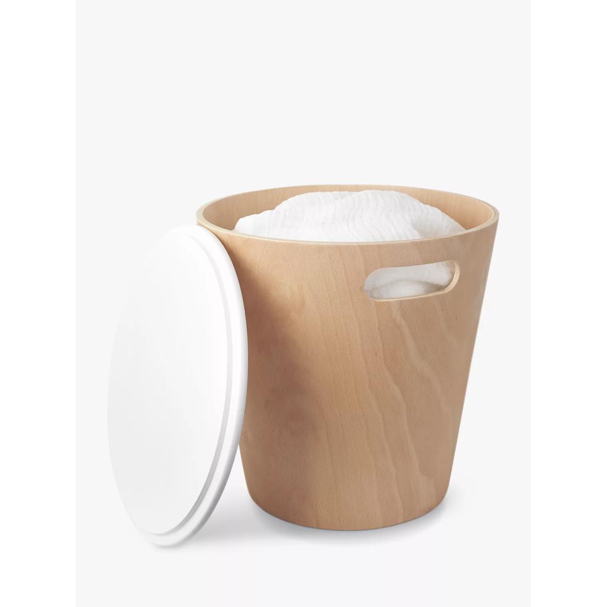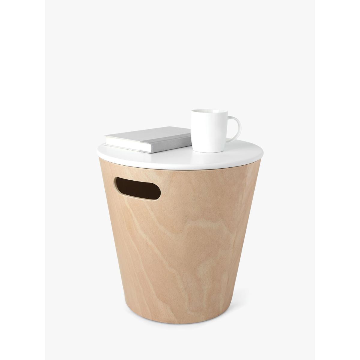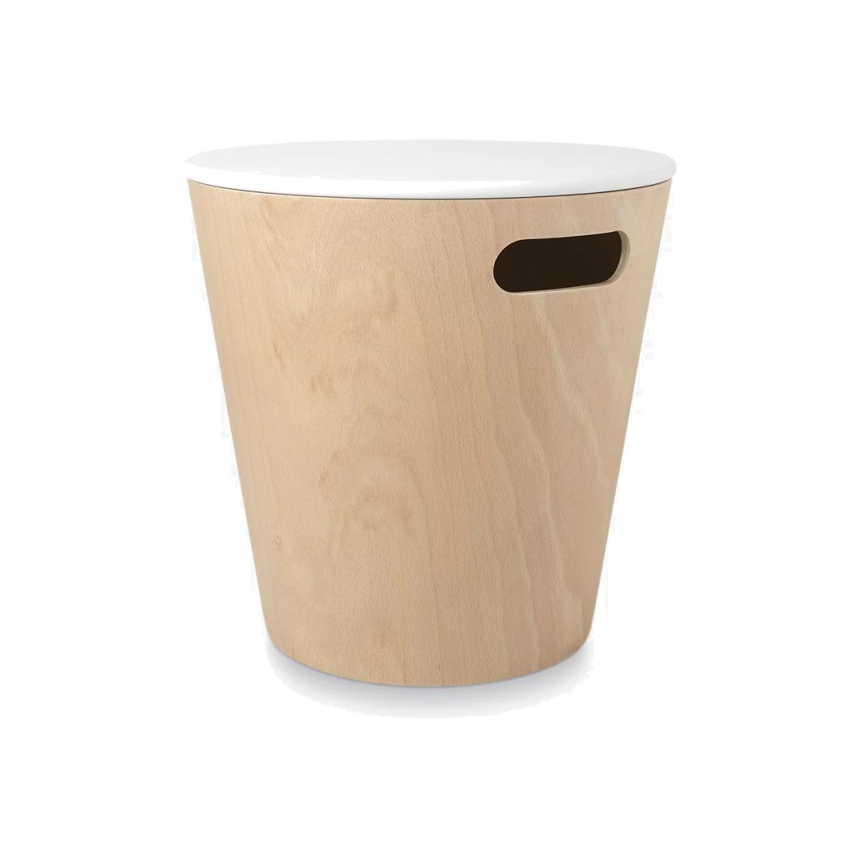 Woodrow is a contemporary and versatile take on the typical Ottoman with its beautiful, natural wood finish and geometric shape. Its lid functions as both a tabletop or a seat, and its integrated handles make it easy to move around the house. It's made from treated, natural wood, bent into a beautifully curved, cylindrical shape. Woodrow's base can store large household items, including blankets, while its lid allows it to function as both a side table and extra seating.
