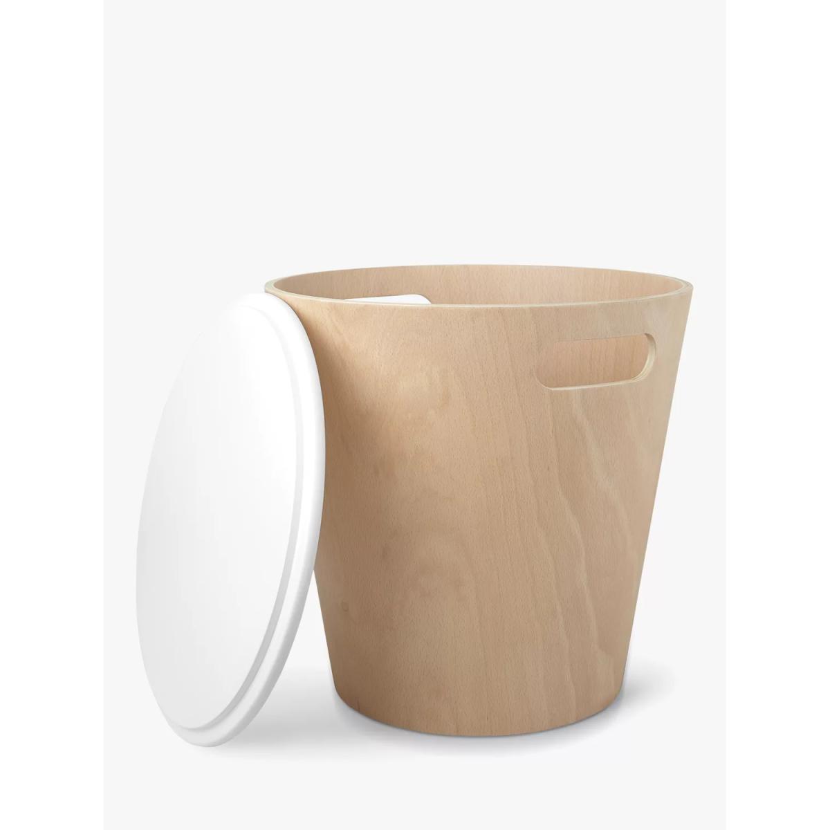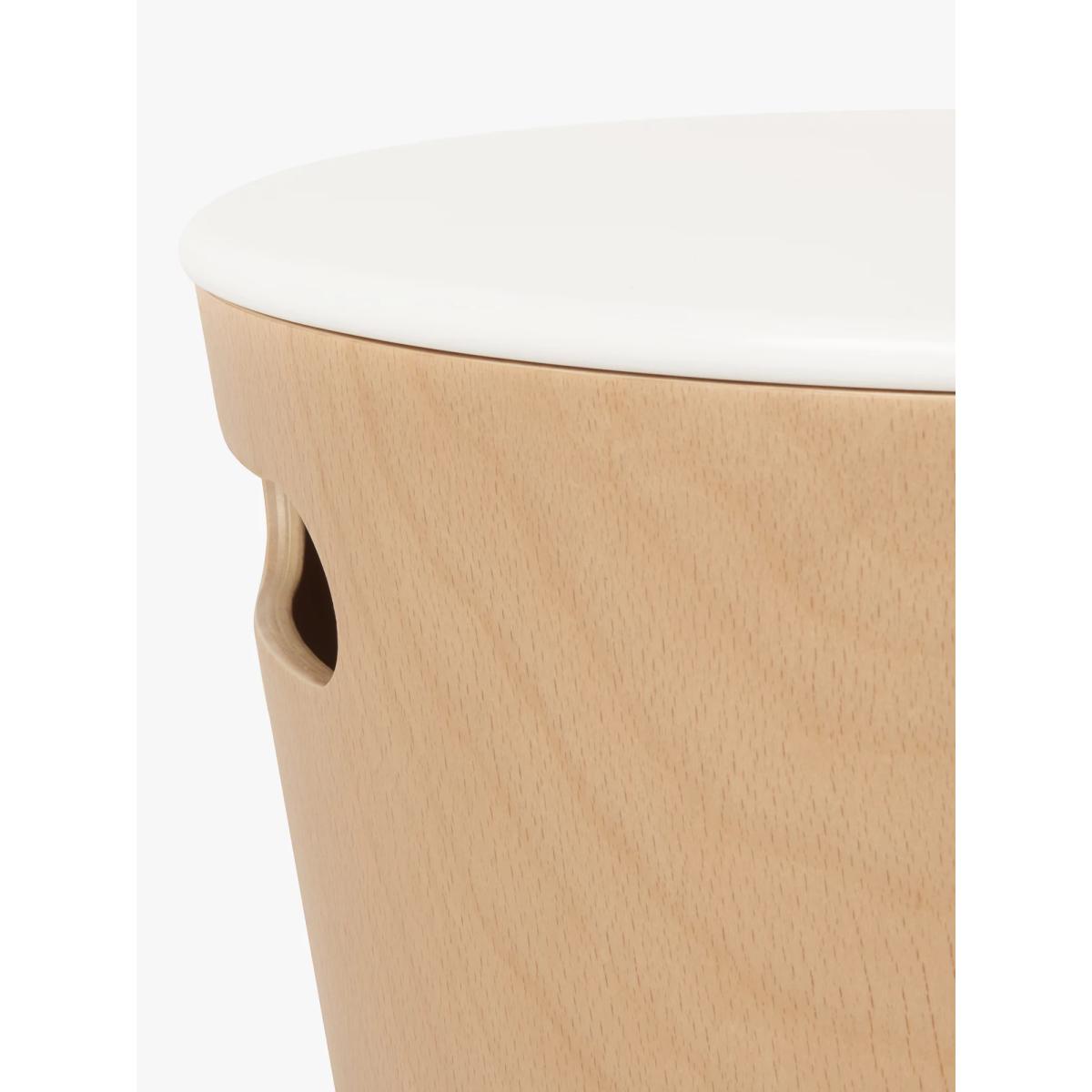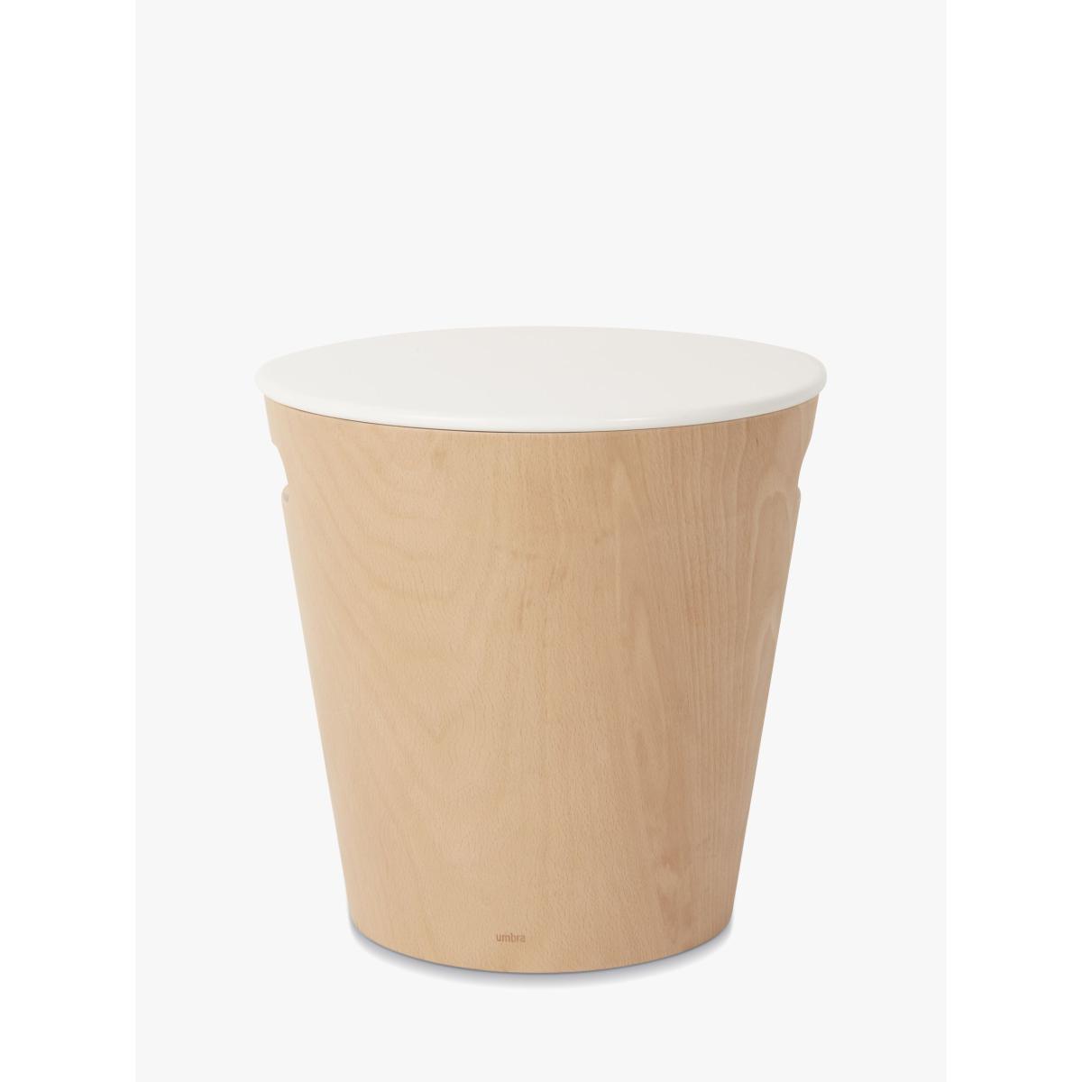 Woodrow is a contemporary and versatile take on the typical Ottoman with its beautiful, natural wood finish and geometric shape. Its lid functions as both a tabletop or a seat, and its integrated handles make it easy to move around the house. It's made from treated, natural wood, bent into a beautifully curved, cylindrical shape. Woodrow's base can store large household items, including blankets, while its lid allows it to function as both a side table and extra seating.