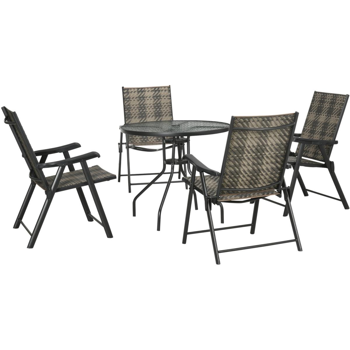 This 5 pieces PE rattan wicker dining set from Outsunny is elegant & modern design. Made of heavy-duty steel frame, wrapped with all hand woven PE wicker, which is a beautiful landscape in your patio and comfortable place to enjoy your leisure time. A round matching table middle with an umbrella hole can fit up to 42mm diameter pole. With this high backrest and wide seat design chairs, enjoy your outdoor living just in the comfort of your own outdoor area!