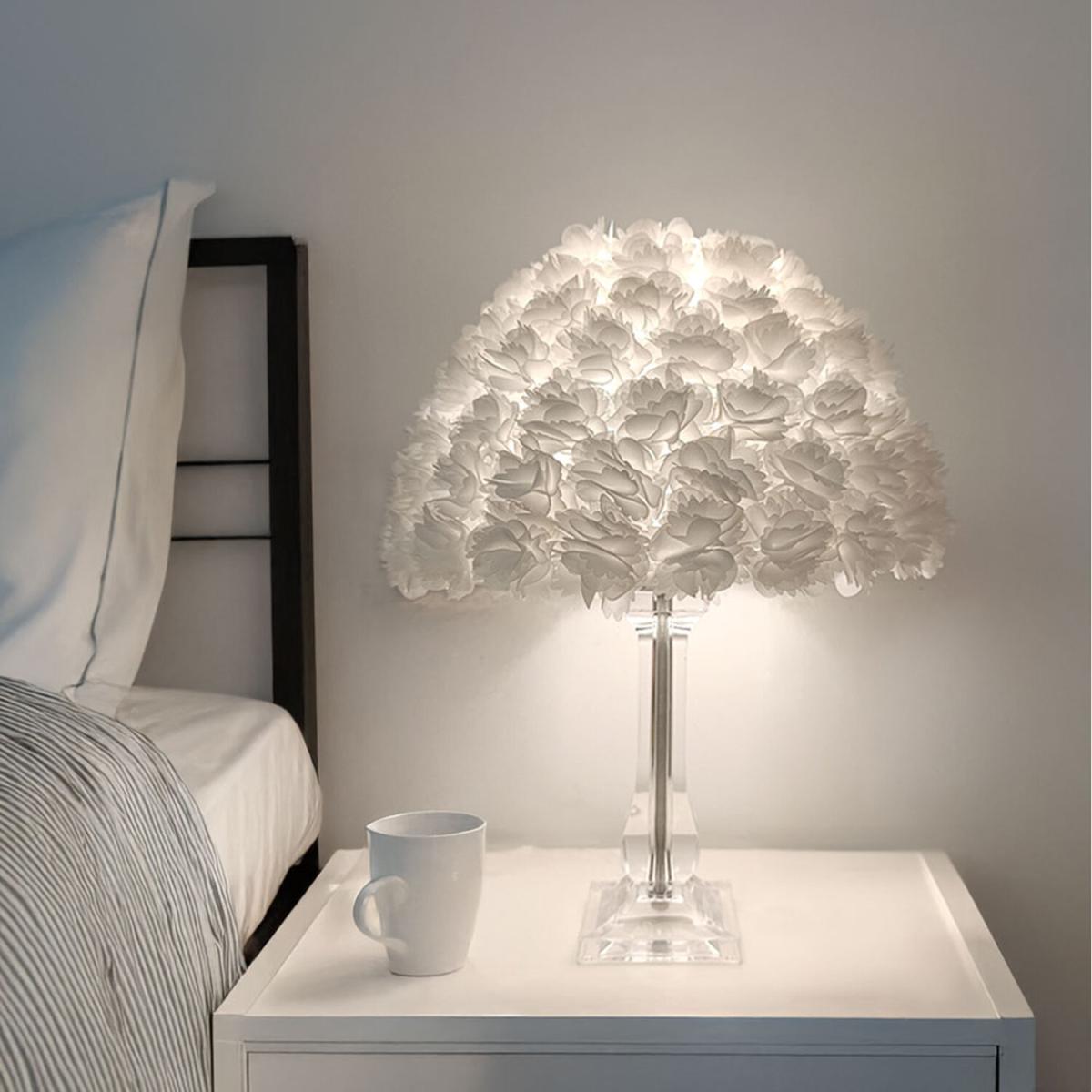 This charming flower table lamp features a white fabric flower lampshade paired with a sleek acrylic base, creating a warm and romantic ambiance for your home. The umbrella-shaped lampshade offers a modern, simple look while providing soft, gentle lighting. The warm glow emitted by the lamp enhances relaxation, making it perfect for the bedroom, where it helps relieve tension and creates a peaceful atmosphere. The transparent acrylic base ensures stability, while the lamp seamlessly fits into any space, whether as a reading light or a decorative nightlight. A lovely addition to your home, this table lamp combines elegance and functionality effortlessly.