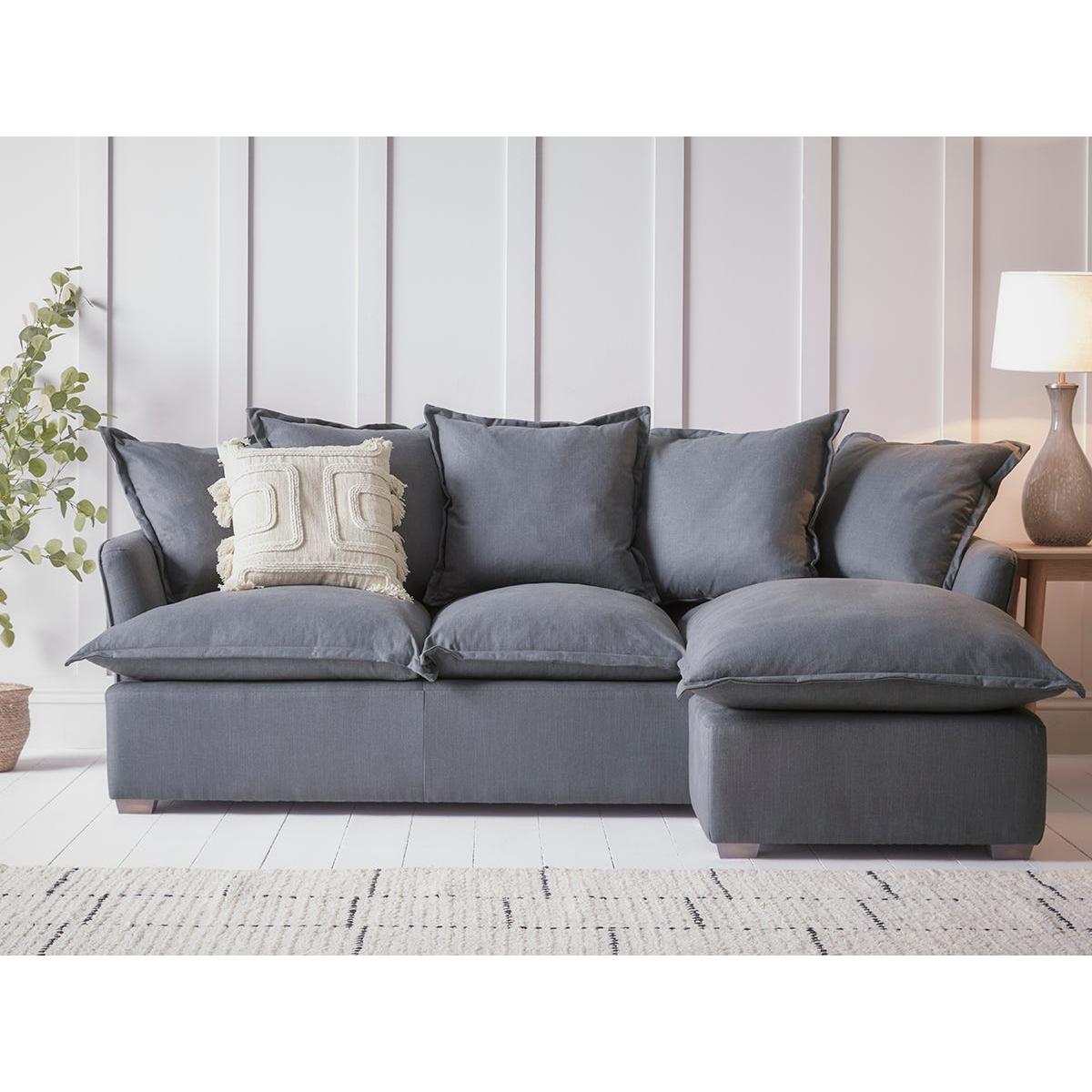 Designed for movie marathons and Sunday afternoon snoozes, our Umea range of made to order upholstered furniture offers inviting and squishy seating you can truly sink into. Sculpt those loosely stacked back cushions to establish the perfect sitting or reclined pose and breathe deep into their supportive comfort. Smart Oxford style pillow case edges to the back and seat cushions smarten up the relaxed look and deeper seats offer extra legroom. This collection offers levels of comfort that makes the occasional plumping session to keep those feather cushions fluffy and fresh feeling a pleasure. The chaise sofa features modern English low arms, feather filled removable and reversible seat and back cushions and polished square tapered wooden legs. The chaise end can be placed to either the right and the left hand side and also separated from the body of the sofa. The Umea range includes a chaise sofa, two seater and three seater sofas, a loveseat, an armchair and an ottoman. Our Umea collection can be upholstered in a choice of 34 distinctive shades and six fabrics to suit your style. Read our Upholstery FAQs View our full Upholstery Terms and Conditions