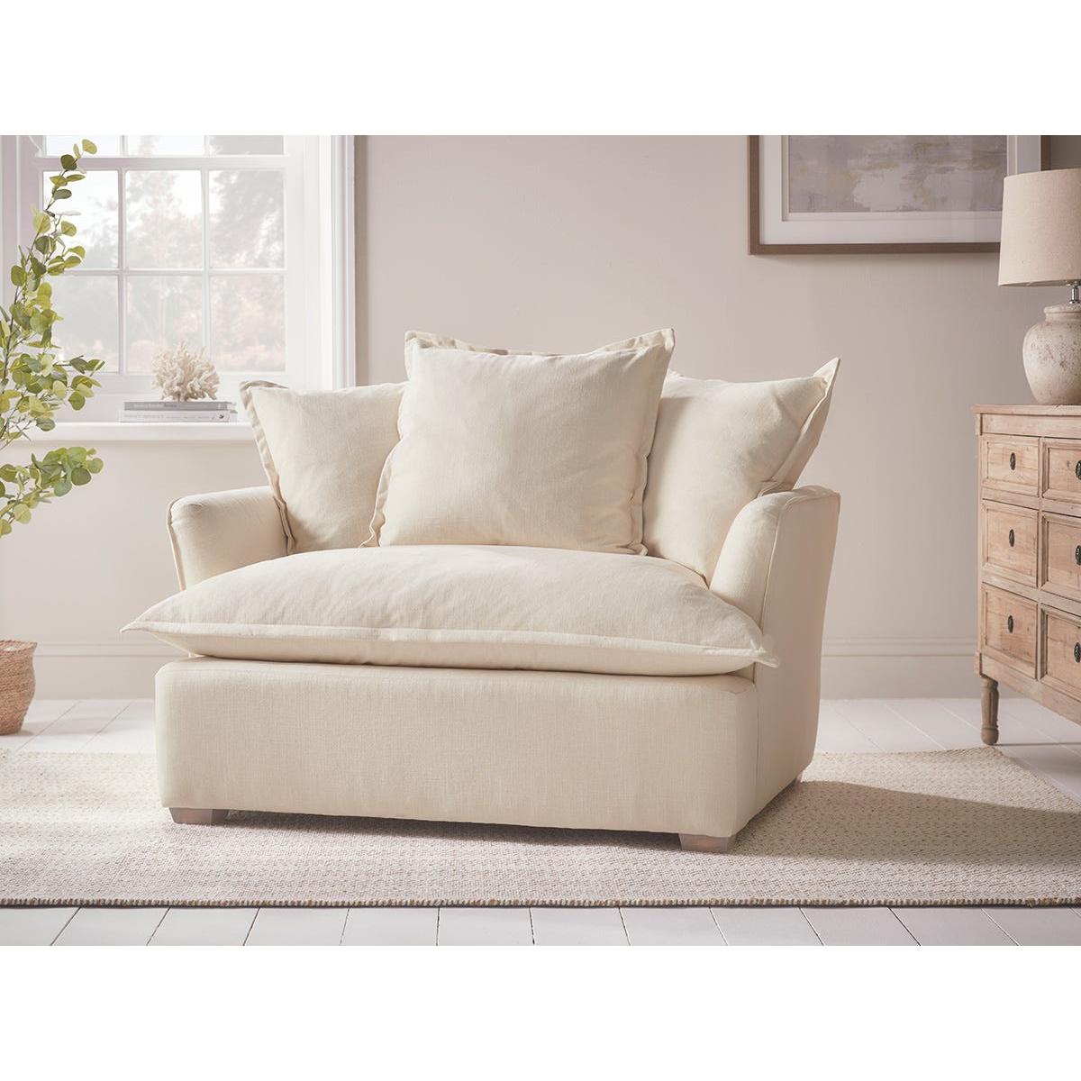 Designed for movie marathons and Sunday afternoon snoozes, our Umea range of made to order upholstered furniture offers inviting and squishy seating you can truly sink into. Sculpt those loosely stacked back cushions to establish the perfect sitting or reclined pose and breathe deep into their supportive comfort. Smart Oxford style pillow case edges to the back and seat cushions smarten up the relaxed look and deeper seats offer extra legroom. This collection offers levels of comfort that makes the occasional plumping session to keep those feather cushions fluffy and fresh feeling a pleasure. The loveseat features modern English low arms, feather filled removable and reversible seat and back cushions and polished square tapered wooden legs. The Umea range includes a chaise sofa, two seater and three seater sofas, a loveseat, an armchair and an ottoman. Our Umea collection can be upholstered in a choice of 34 distinctive shades and six fabrics to suit your style. Read our Upholstery FAQs View our full Upholstery Terms and Conditions