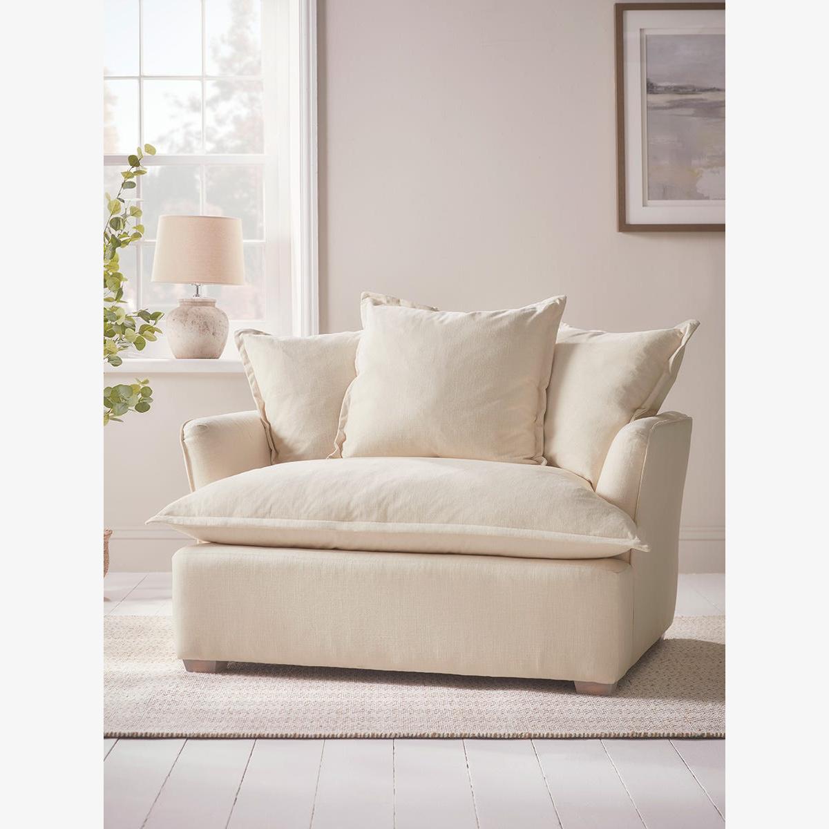 Designed for movie marathons and Sunday afternoon snoozes, our Umea range of made to order upholstered furniture offers inviting and squishy seating you can truly sink into. Sculpt those loosely stacked back cushions to establish the perfect sitting or reclined pose and breathe deep into their supportive comfort. Smart Oxford style pillow case edges to the back and seat cushions smarten up the relaxed look and deeper seats offer extra legroom. This collection offers levels of comfort that makes the occasional plumping session to keep those feather cushions fluffy and fresh feeling a pleasure. The loveseat features modern English low arms, feather filled removable and reversible seat and back cushions and polished square tapered wooden legs. The Umea range includes a chaise sofa, two seater and three seater sofas, a loveseat, an armchair and an ottoman. Our Umea collection can be upholstered in a choice of 34 distinctive shades and six fabrics to suit your style. Read our Upholstery FAQs View our full Upholstery Terms and Conditions