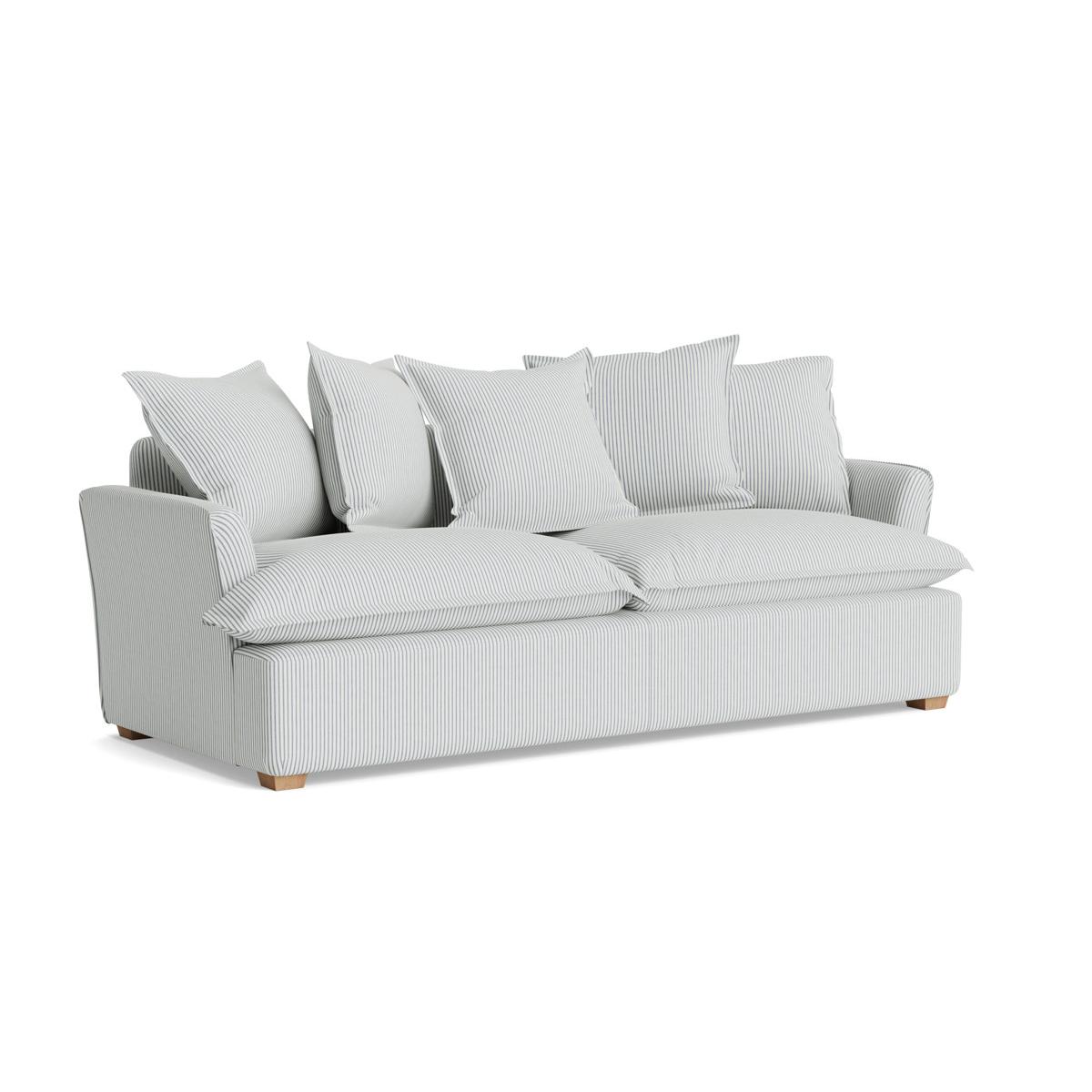 Designed for movie marathons and Sunday afternoon snoozes, our Umea range of made to order upholstered furniture offers inviting and squishy seating you can truly sink into. Sculpt those loosely stacked back cushions to establish the perfect sitting or reclined pose and breathe deep into their supportive comfort. Smart Oxford style pillow case edges to the back and seat cushions smarten up the relaxed look and deeper seats offer extra legroom. This collection offers levels of comfort that makes the occasional plumping session to keep those feather cushions fluffy and fresh feeling a pleasure. The sofa is available as a two seater or three seater and features modern English low arms, feather filled removable and reversible seat and back cushions and polished square tapered wooden legs. The Umea range includes a chaise sofa, two seater and three seater sofas, a loveseat, an armchair and an ottoman. Pictured here in our French Blue stripe material, our Umea collection can be upholstered in a choice of 34 distinctive shades and six fabrics to suit your style. Read our Upholstery FAQs View our full Upholstery Terms and Conditions