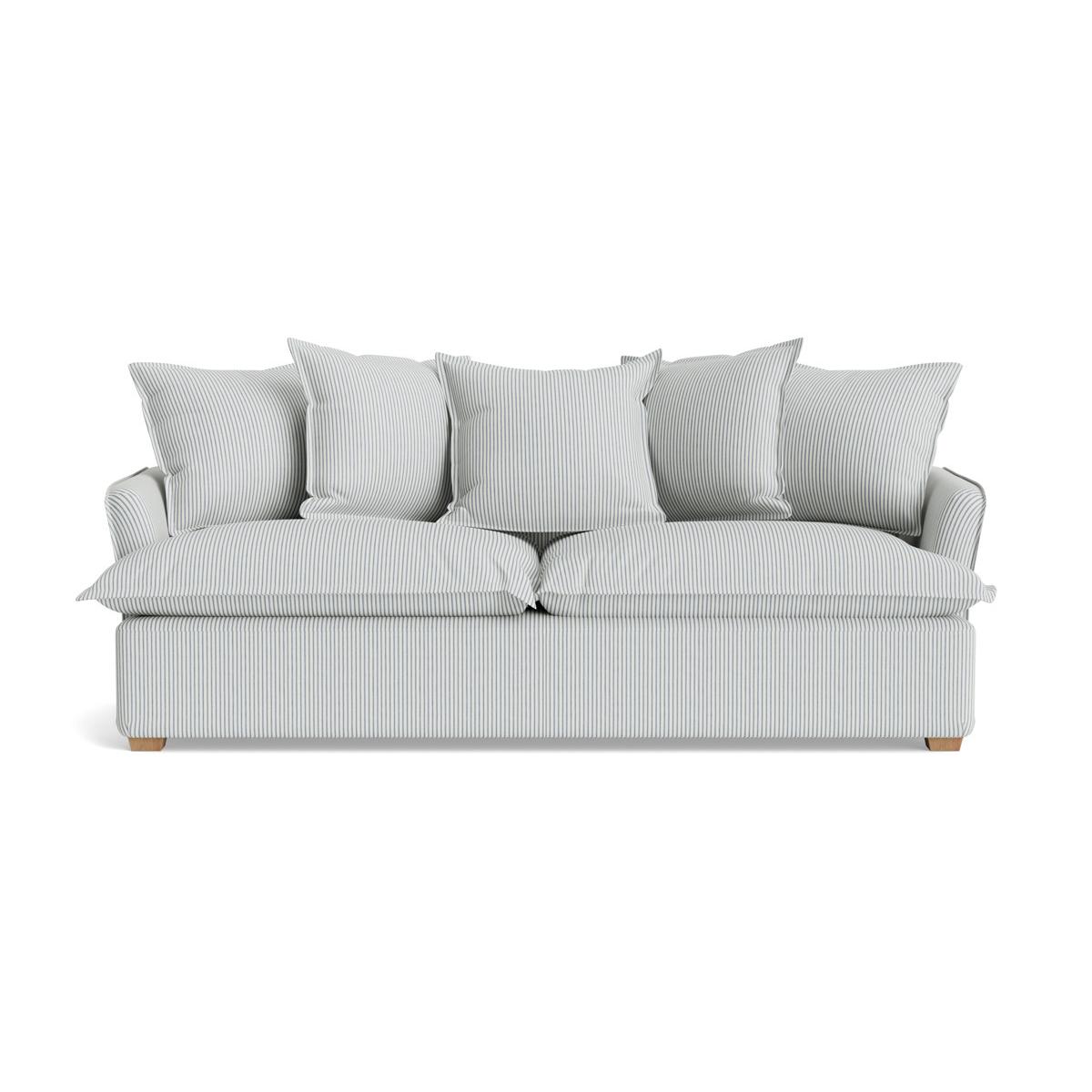 Designed for movie marathons and Sunday afternoon snoozes, our Umea range of made to order upholstered furniture offers inviting and squishy seating you can truly sink into. Sculpt those loosely stacked back cushions to establish the perfect sitting or reclined pose and breathe deep into their supportive comfort. Smart Oxford style pillow case edges to the back and seat cushions smarten up the relaxed look and deeper seats offer extra legroom. This collection offers levels of comfort that makes the occasional plumping session to keep those feather cushions fluffy and fresh feeling a pleasure. The sofa is available as a two seater or three seater and features modern English low arms, feather filled removable and reversible seat and back cushions and polished square tapered wooden legs. The Umea range includes a chaise sofa, two seater and three seater sofas, a loveseat, an armchair and an ottoman. Pictured here in our French Blue stripe material, our Umea collection can be upholstered in a choice of 34 distinctive shades and six fabrics to suit your style. Read our Upholstery FAQs View our full Upholstery Terms and Conditions
