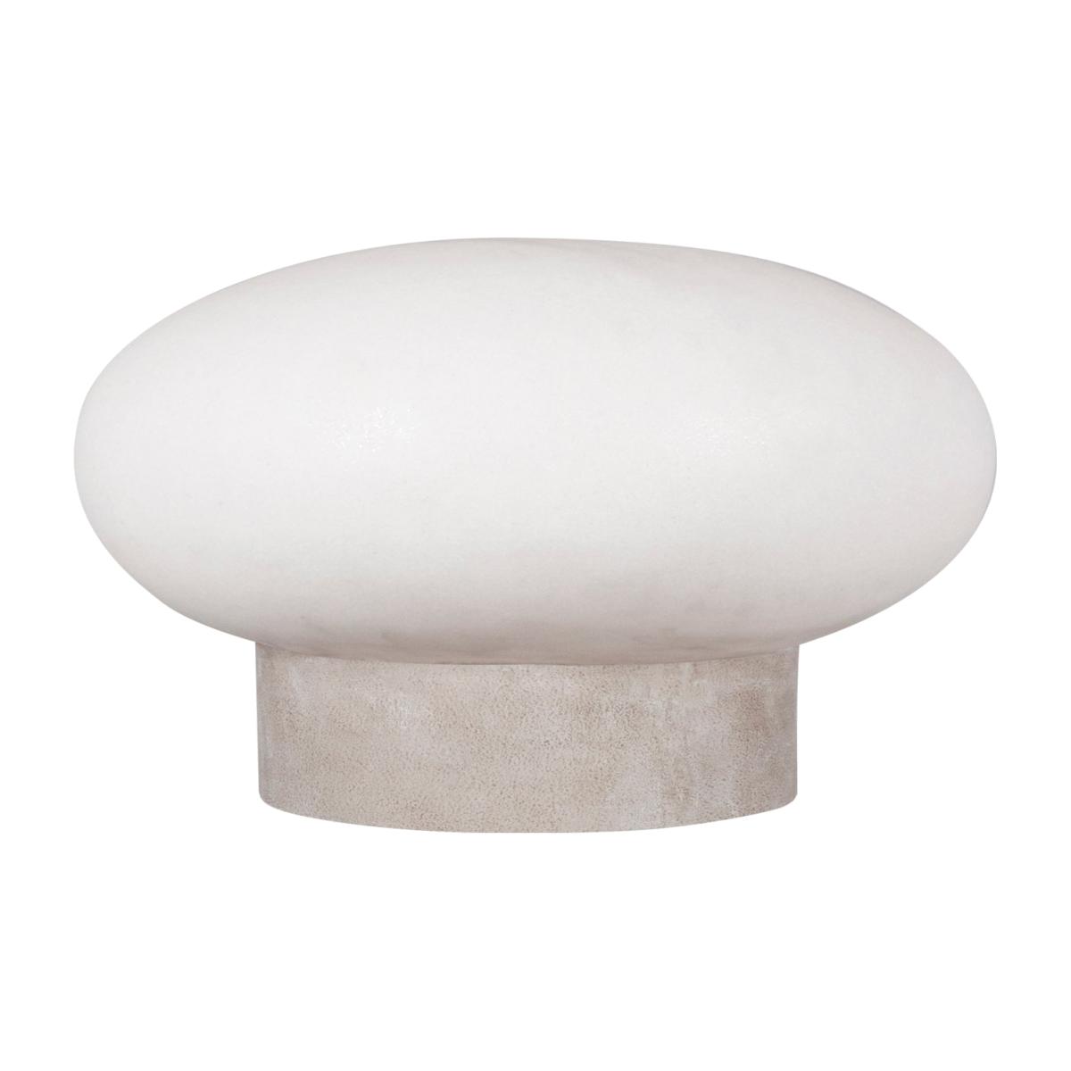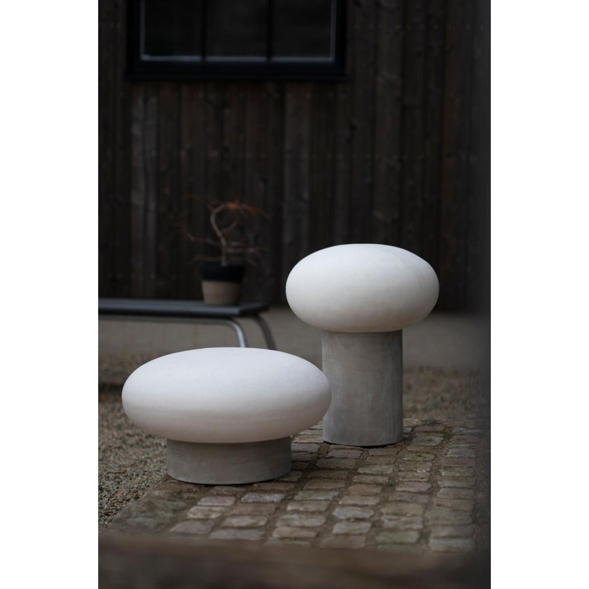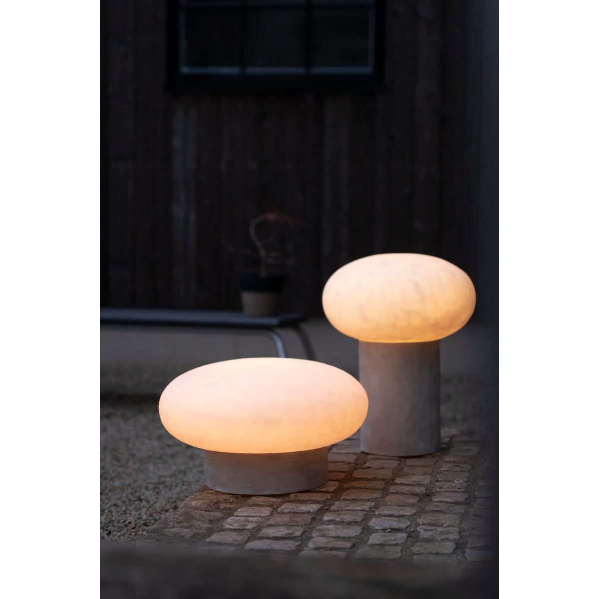 Umfors floor lamp 50 cm from Swedish Globen Lighting is a round lamp with a lampshade made of opal glass which creates a soft and atmospheric glow, indoors or outdoors. The lampshade stands on a high marble base, which according to designer Malin Lundmark symbolises the mountains in Umfors set against the ice represented by the lampshade.